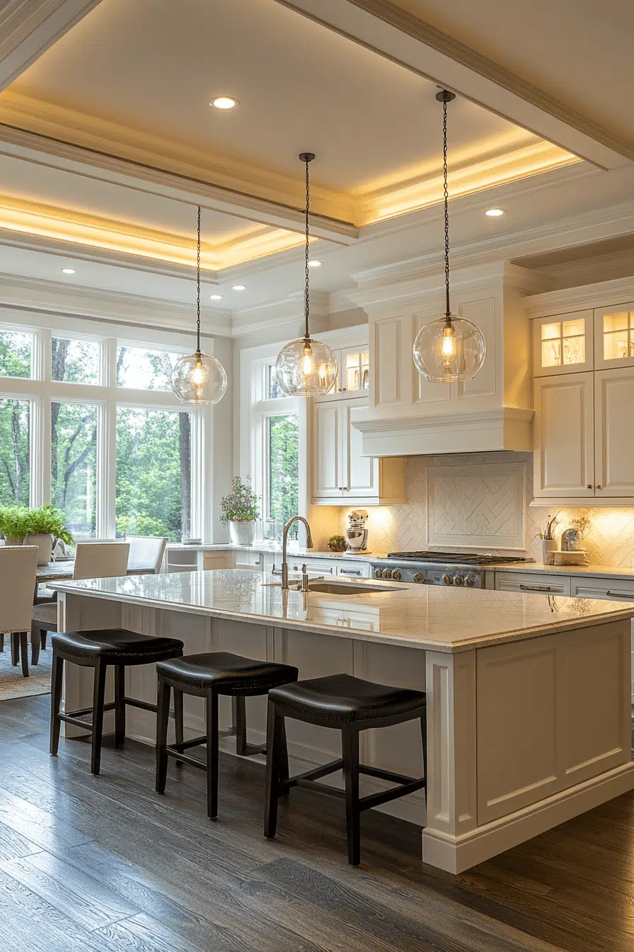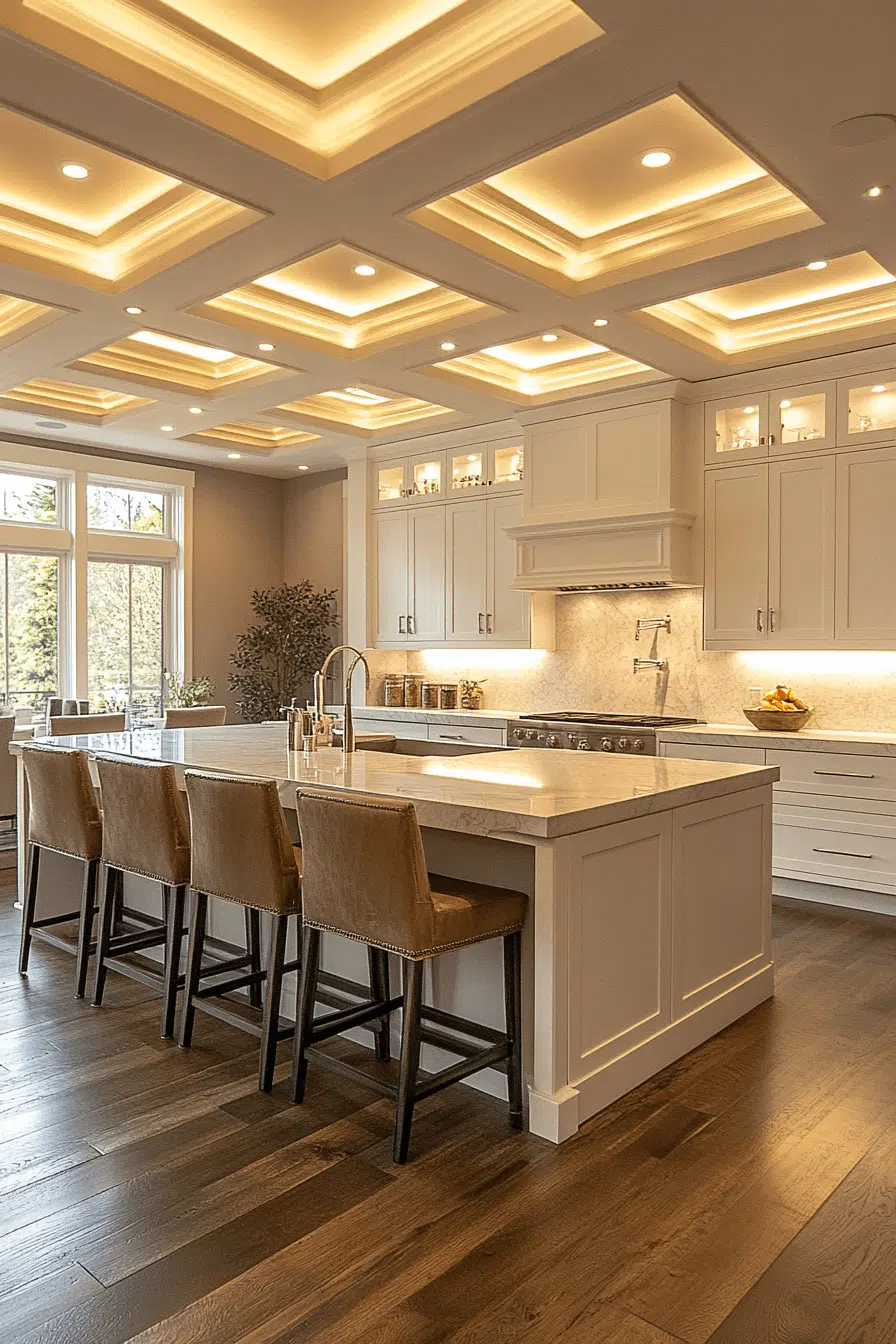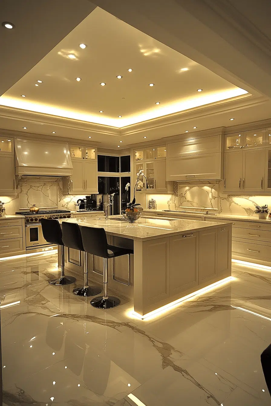 Indirect illumination gains elegance through cove-style kitchen lighting ideas. Light gently reflects across ceilings or walls for a soft, luxurious effect. This approach enhances architectural features while expanding the visual space. Cove lighting suits modern and high-ceiling kitchens particularly well. The ambiance feels calm and refined. Explore cove lighting ideas that introduce understated luxury into your kitchen!