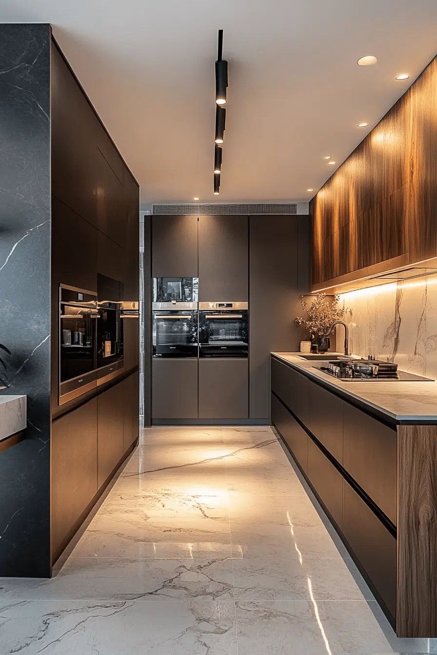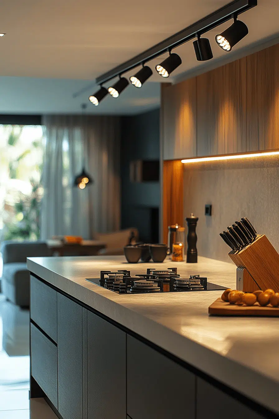 Adjustable track systems remain flexible kitchen lighting ideas for evolving layouts. Movable heads allow illumination to shift as needs change. This versatility suits open-concept kitchens especially well. Track lighting offers wide coverage without visual heaviness. The look remains sleek and contemporary. Discover track lighting solutions that keep your kitchen adaptable and bright!