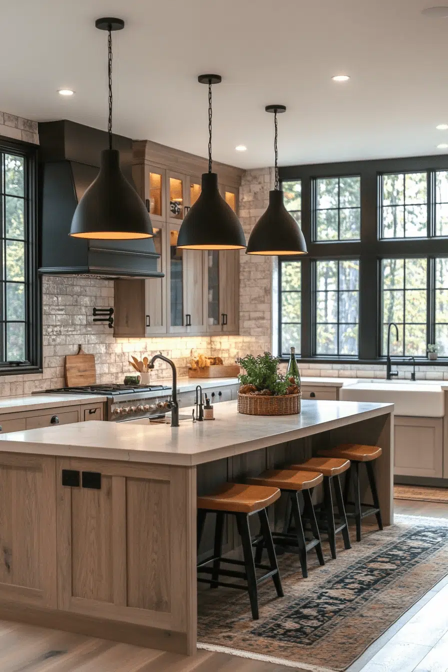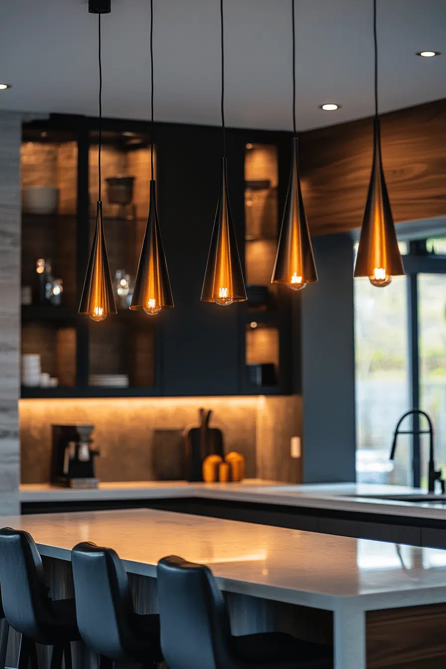 Dramatic contrast emerges with dark-finished fixtures as bold kitchen lighting ideas. Against lighter cabinetry, black designs create striking visual balance. These fixtures complement modern and minimalist kitchens effortlessly. The contrast grounds the room visually. Coordinated finishes enhance cohesion. Discover black lighting ideas that bring confident sophistication to your kitchen!
