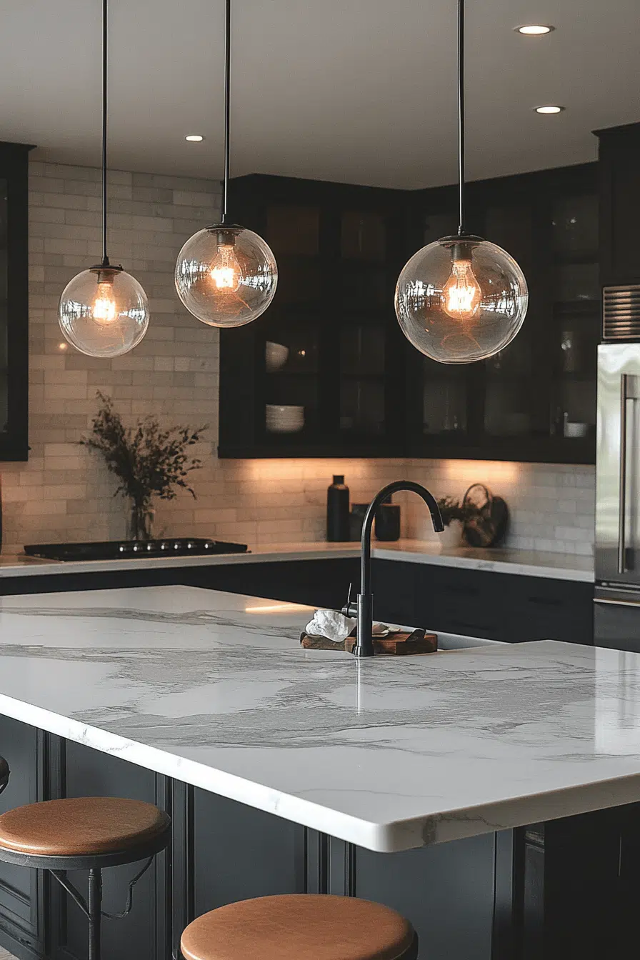 Rounded silhouettes introduce playful elegance as timeless kitchen lighting ideas. Globe fixtures emit soft, evenly distributed light throughout the room. Their form adds personality without overwhelming the space. Used individually or in clusters, they create visual rhythm. This style bridges classic and contemporary aesthetics. Explore globe lighting ideas that add warmth and charm to your kitchen!