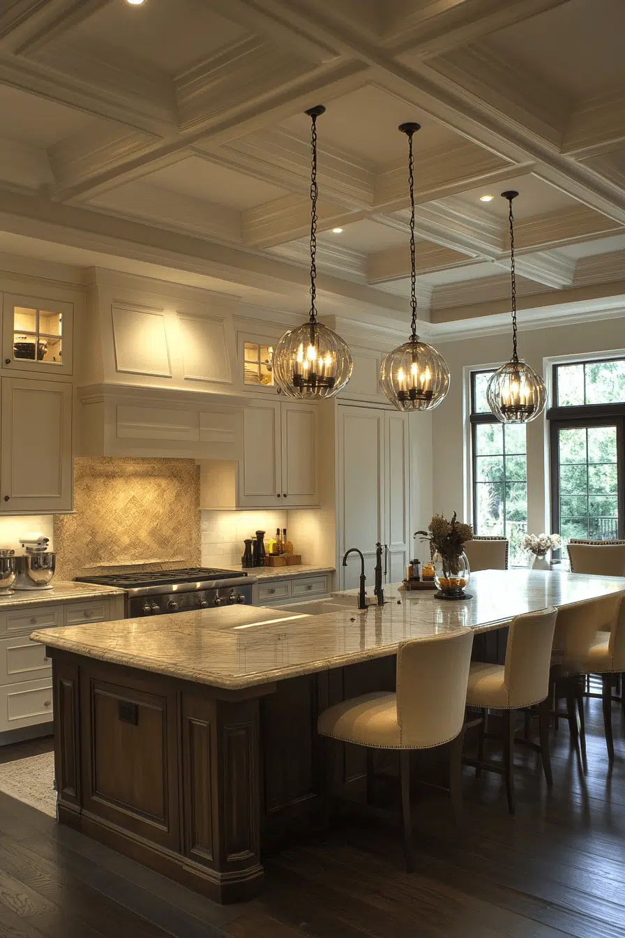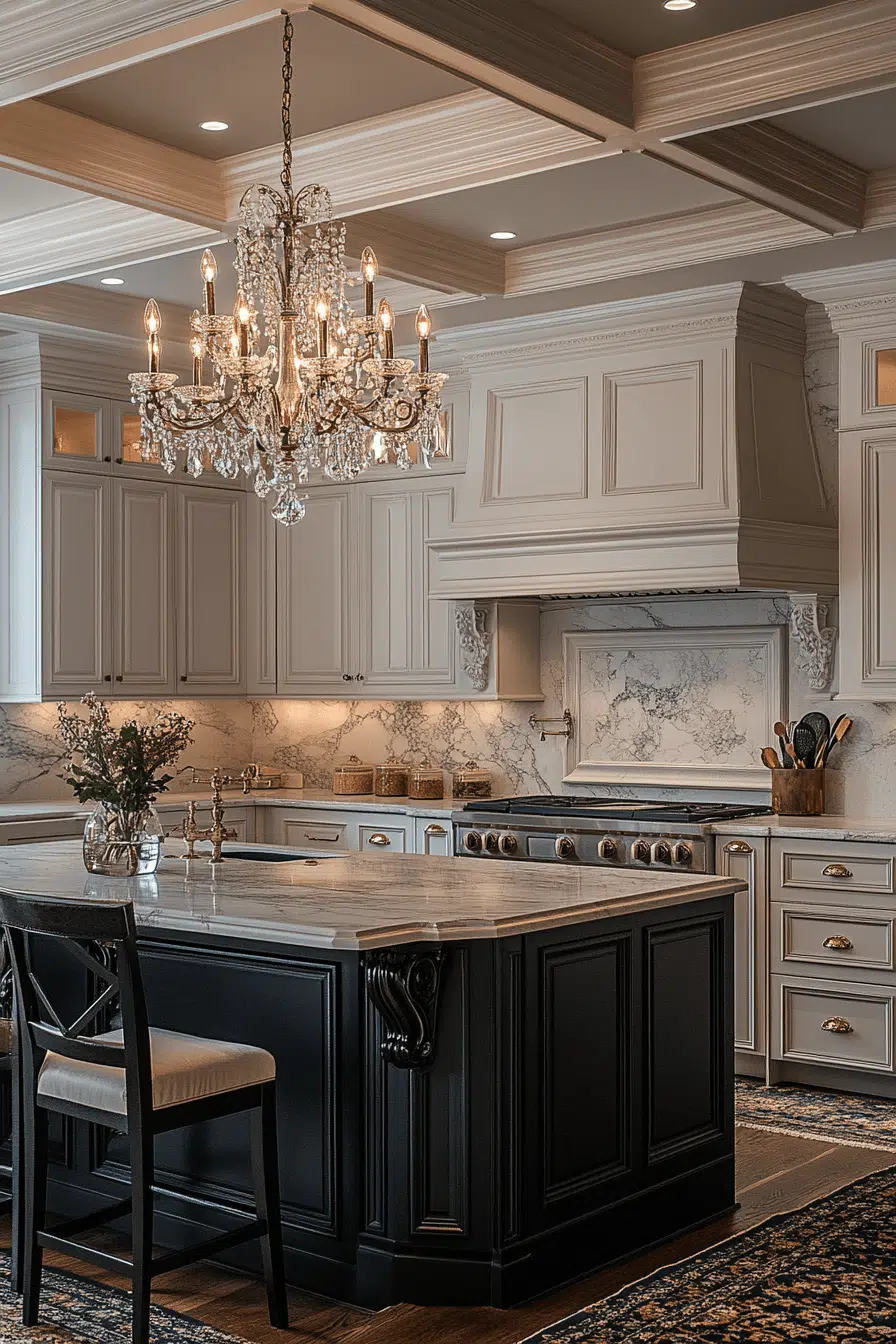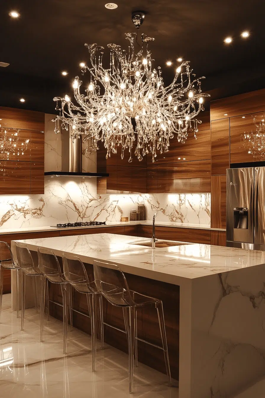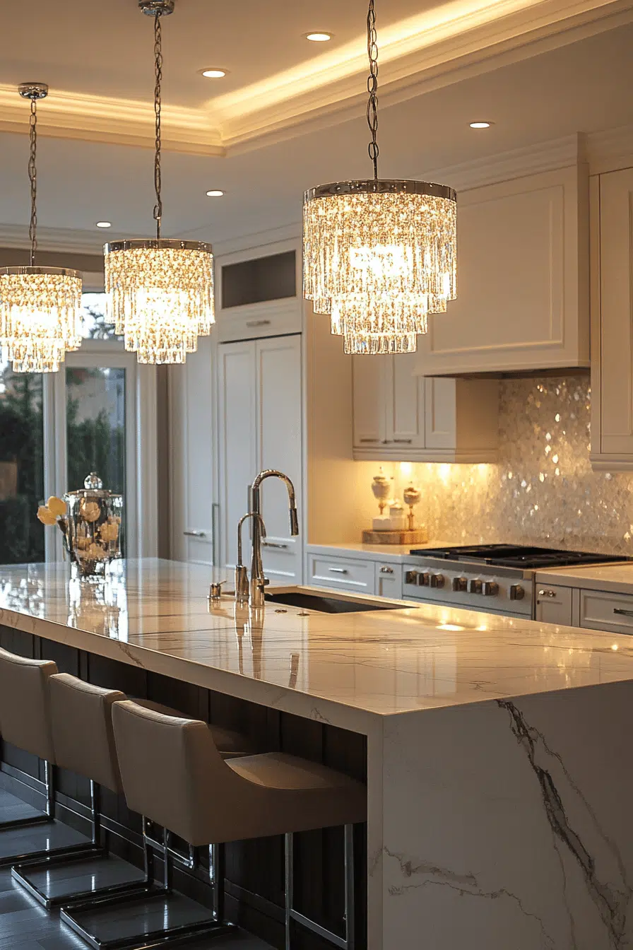Reflective brilliance defines glass chandeliers as luxurious kitchen lighting ideas. Transparent surfaces amplify light throughout the space. Positioned above islands or dining areas, they elevate entertaining zones. Designs range from modern to classic silhouettes. These fixtures add drama and polish. Discover glass chandelier lighting ideas that create unforgettable kitchen statements!