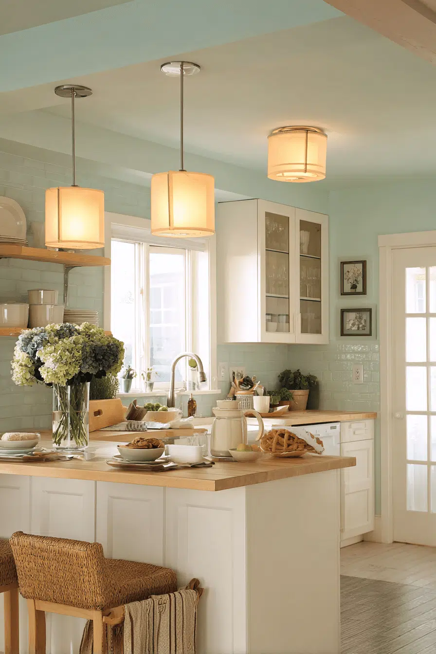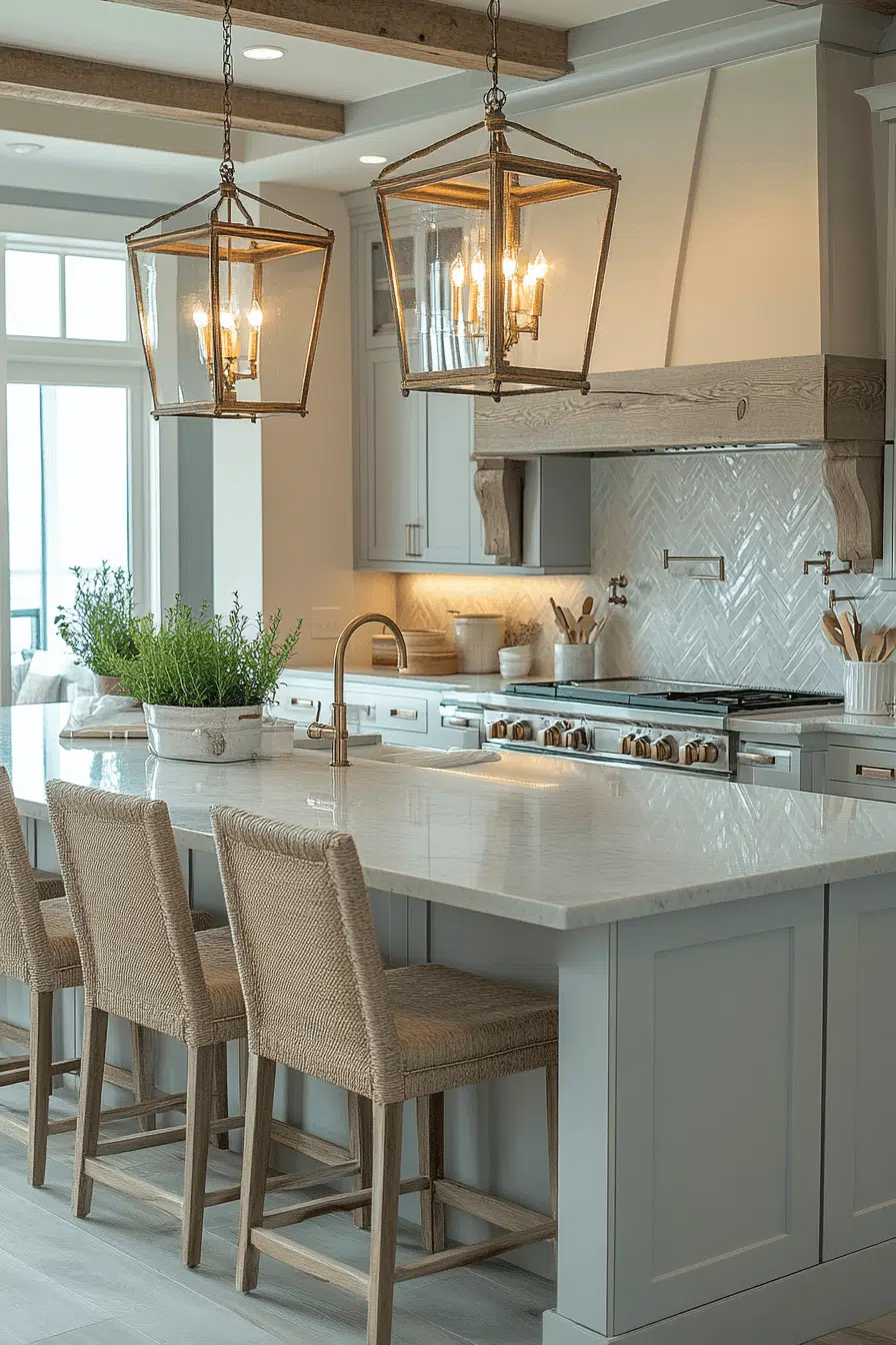 Seaside-inspired interiors benefit from lantern-style coastal kitchen lighting ideas. Glass panels and metal frames echo nautical design elements. The illumination feels light and relaxed. These fixtures pair effortlessly with pale woods and neutral palettes. Coastal lanterns reinforce a breezy aesthetic. Explore coastal lighting ideas that bring beach-inspired calm indoors!
