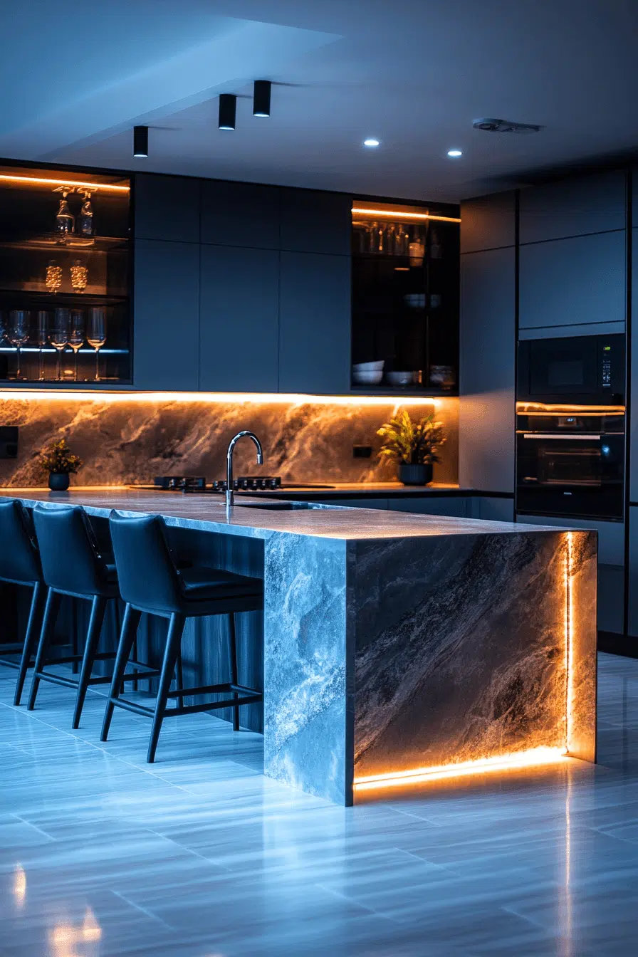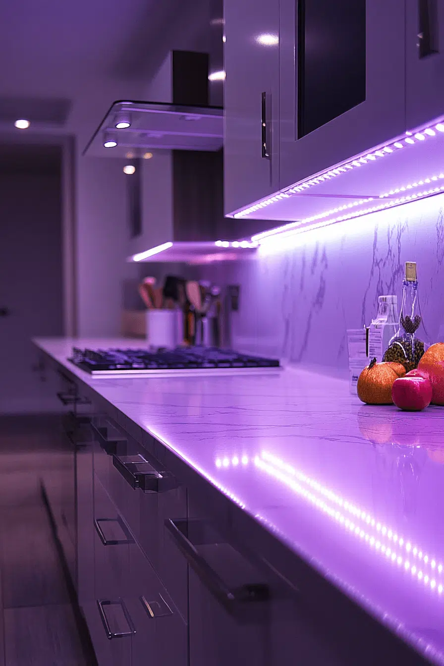Mood-enhancing illumination becomes achievable through LED strips as contemporary kitchen lighting ideas. Installed beneath shelving, cabinetry, or islands, they add a soft yet striking glow. Adjustable color temperatures allow the atmosphere to shift from warm to cool effortlessly. Their flexibility supports installation in narrow or unconventional spaces. The overall effect feels both modern and inviting. Explore LED strip lighting ideas that transform kitchens with subtle sophistication!