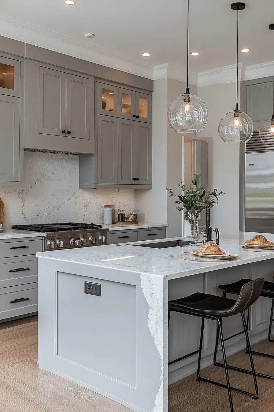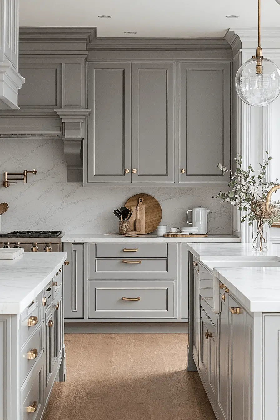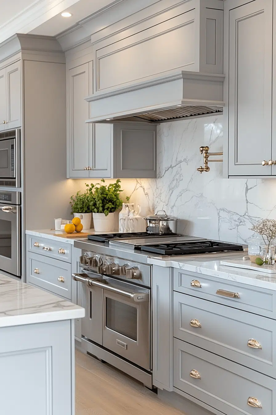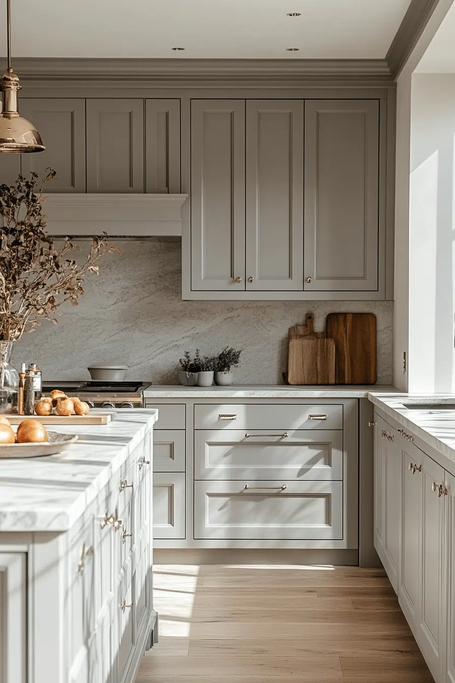 Light grey kitchen cabinets paired with marble surfaces create refined visual contrast. Grey allows the marble veining to stand out beautifully. The combination feels elegant without excess. Metallic accents enhance the luxury subtly. This pairing remains timeless and adaptable. Explore classic elegance with grey and marble!