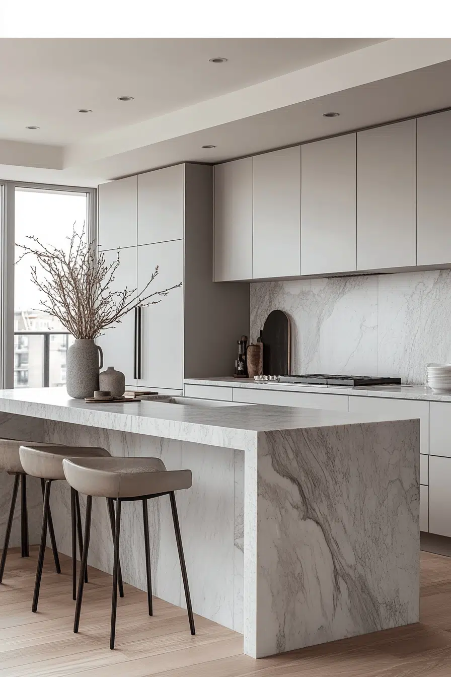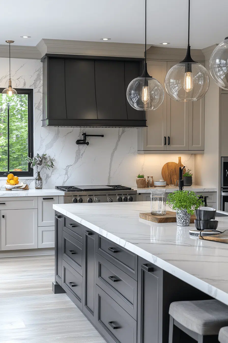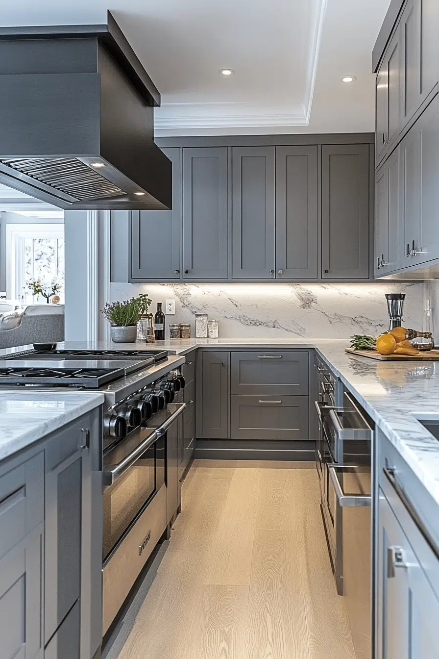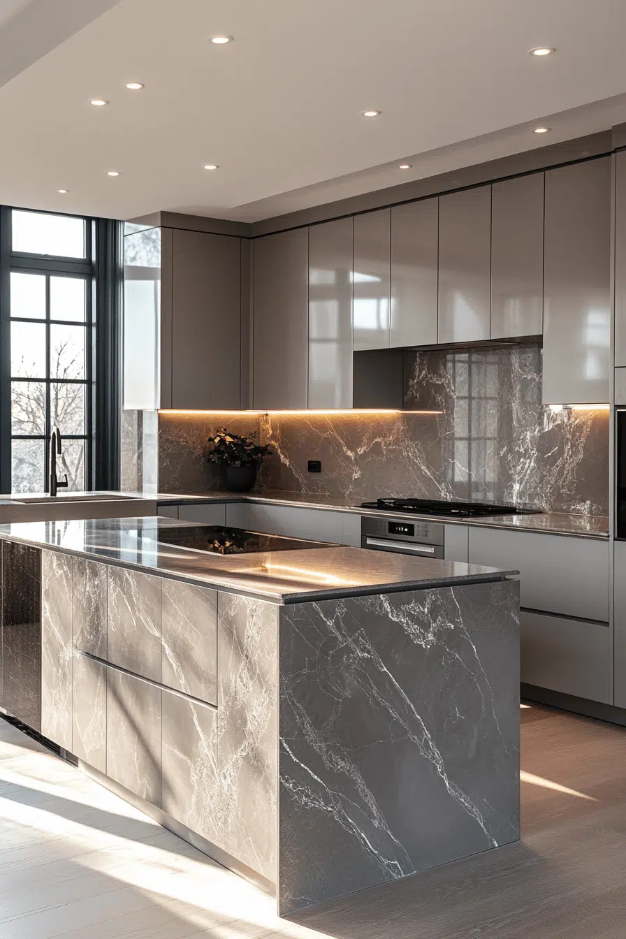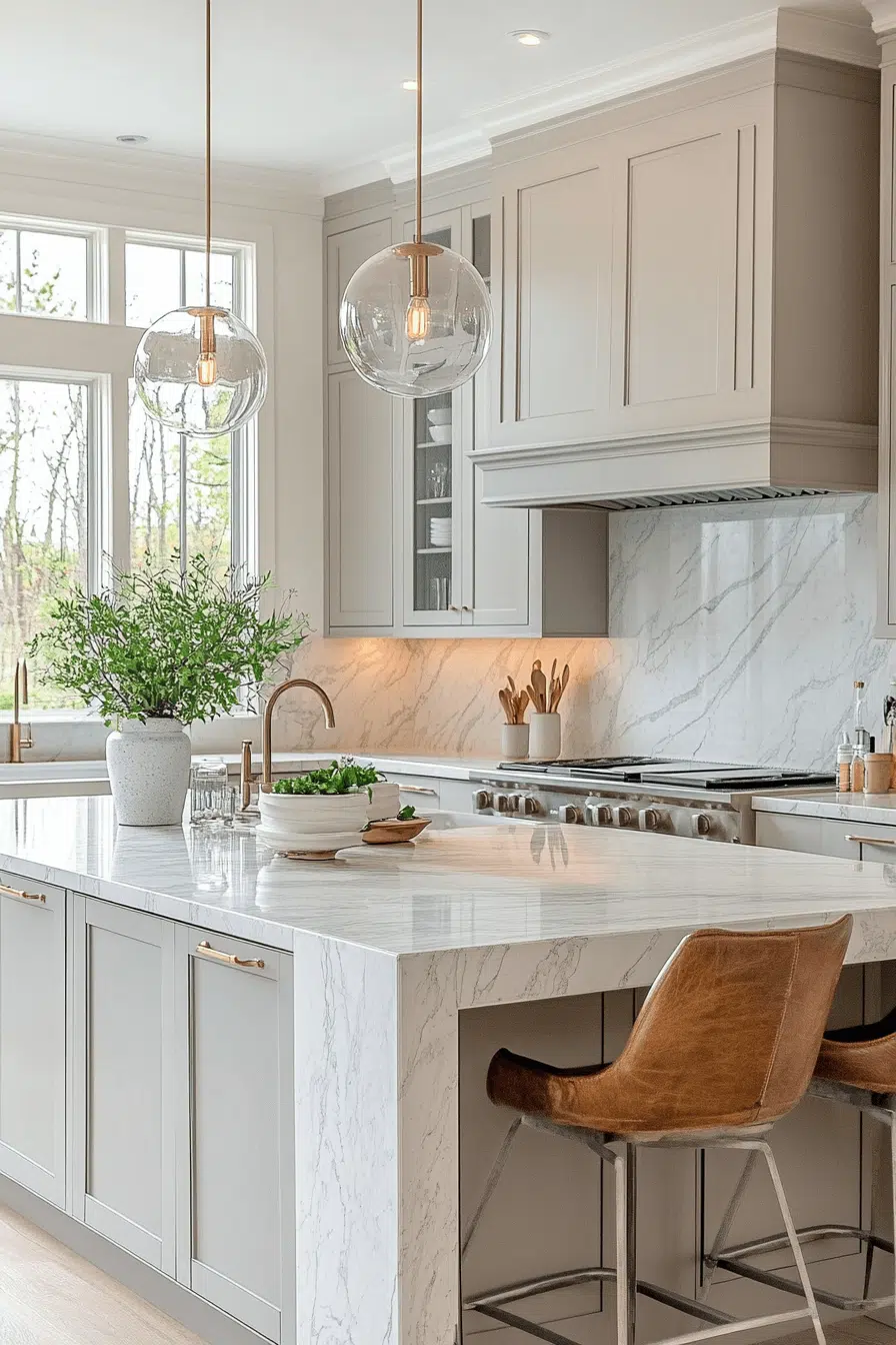 Light grey kitchen cabinets paired with marble surfaces create refined visual contrast. Grey allows the marble veining to stand out beautifully. The combination feels elegant without excess. Metallic accents enhance the luxury subtly. This pairing remains timeless and adaptable. Explore classic elegance with grey and marble!