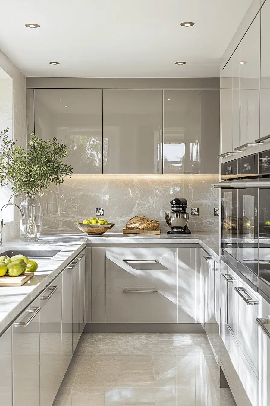 Glossy light grey kitchen cabinets amplify light and openness in any space. The reflective finish adds energy while grey keeps it sophisticated. Smaller kitchens especially benefit from the added brightness. Smooth surfaces also offer easy maintenance. The result is sleek and practical. Shine brighter with glossy grey kitchen inspiration!