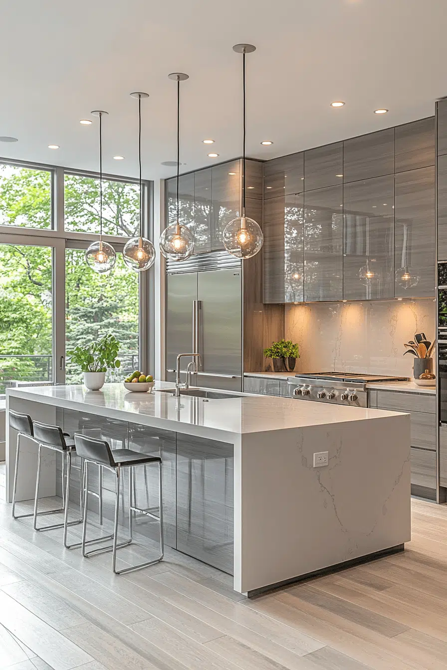 Polished light grey kitchen cabinets reflect contemporary style with refined shine. The finish amplifies light while maintaining sophistication. Clean hardware keeps the look sleek. Grey prevents the space from feeling too glossy. The balance feels modern and upscale. Explore polished grey elegance today!
