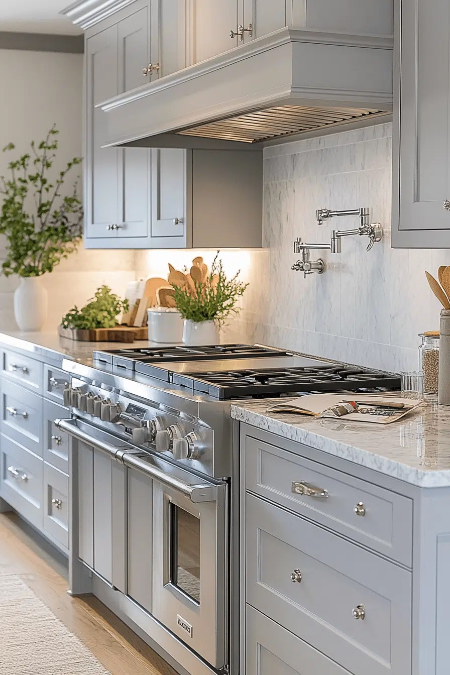Soft light grey kitchen cabinets create the perfect base for understated luxury. Plush textures and refined materials stand out without overpowering. Grey provides balance while letting details shine. The look feels elegant, not excessive. It’s modern luxury with restraint. Discover refined layering in grey kitchens!