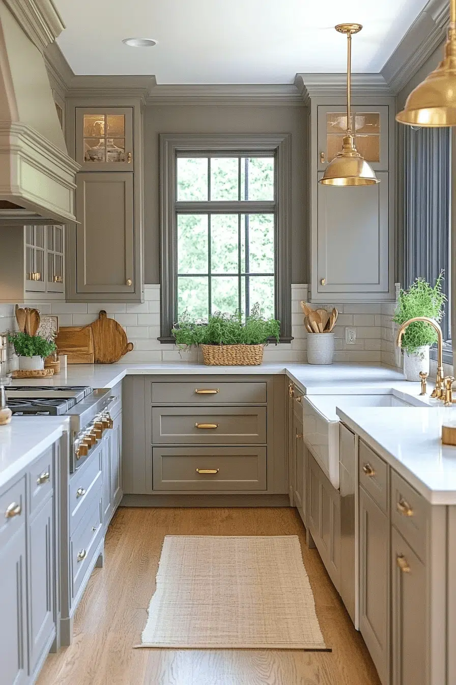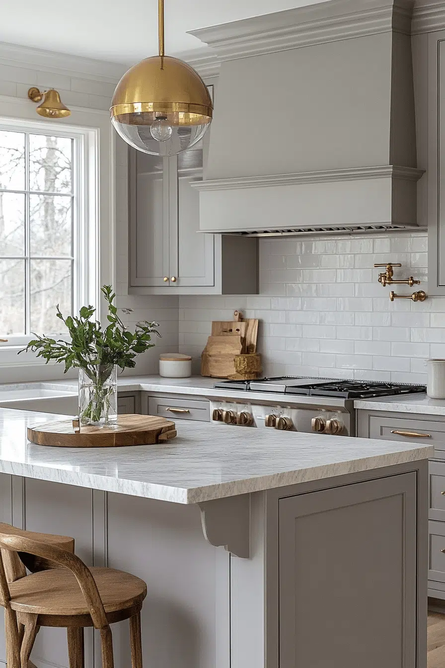 Gold accents paired with light grey kitchen cabinets bring warmth and subtle glamour. Grey acts as a sophisticated backdrop for metallic shine. Even small gold details feel intentional and elevated. The result is chic and curated. This pairing adds instant polish. Elevate your grey kitchen with golden accents!