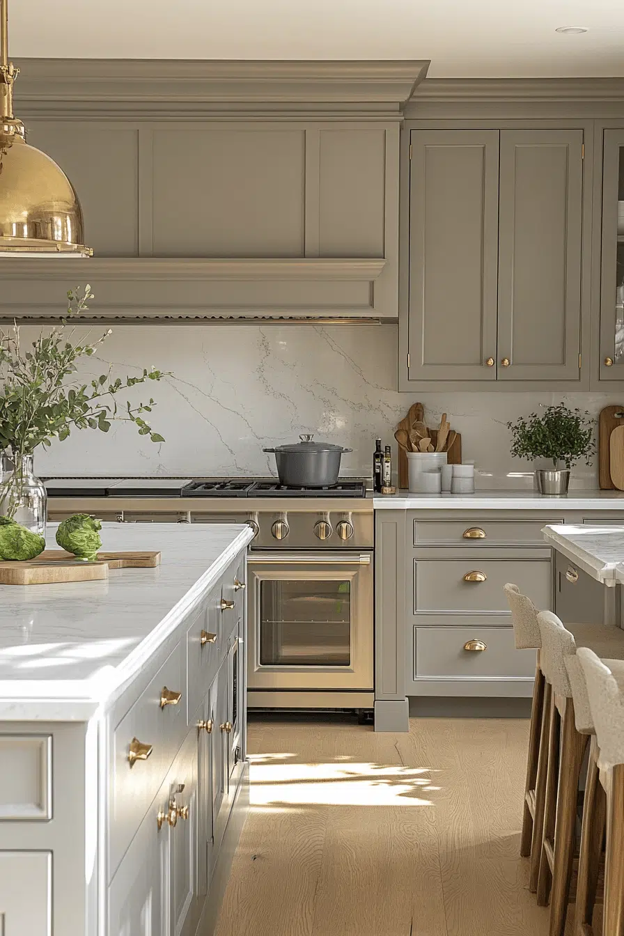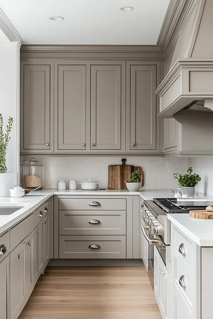 Warm-infused light grey kitchen cabinets bring comfort to contemporary design. Subtle beige undertones soften the coolness often associated with grey. This shade pairs beautifully with brass, champagne, or warm wood accents. The space feels welcoming while staying modern. It’s perfect for kitchens that crave warmth without heaviness. Explore inviting warm-grey kitchen inspiration!
