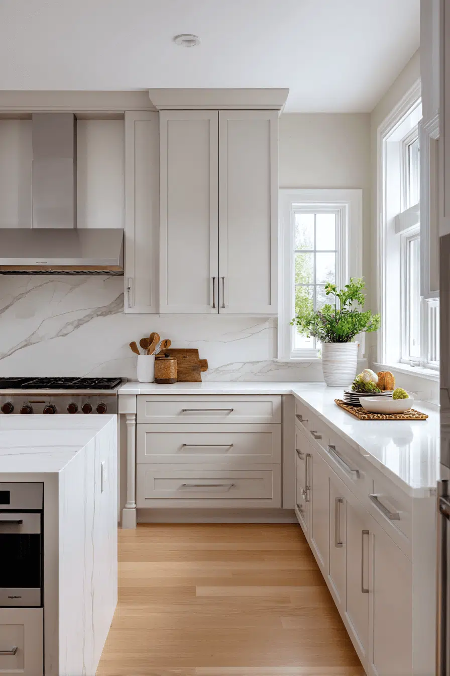 Warm-infused light grey kitchen cabinets bring comfort to contemporary design. Subtle beige undertones soften the coolness often associated with grey. This shade pairs beautifully with brass, champagne, or warm wood accents. The space feels welcoming while staying modern. It’s perfect for kitchens that crave warmth without heaviness. Explore inviting warm-grey kitchen inspiration!