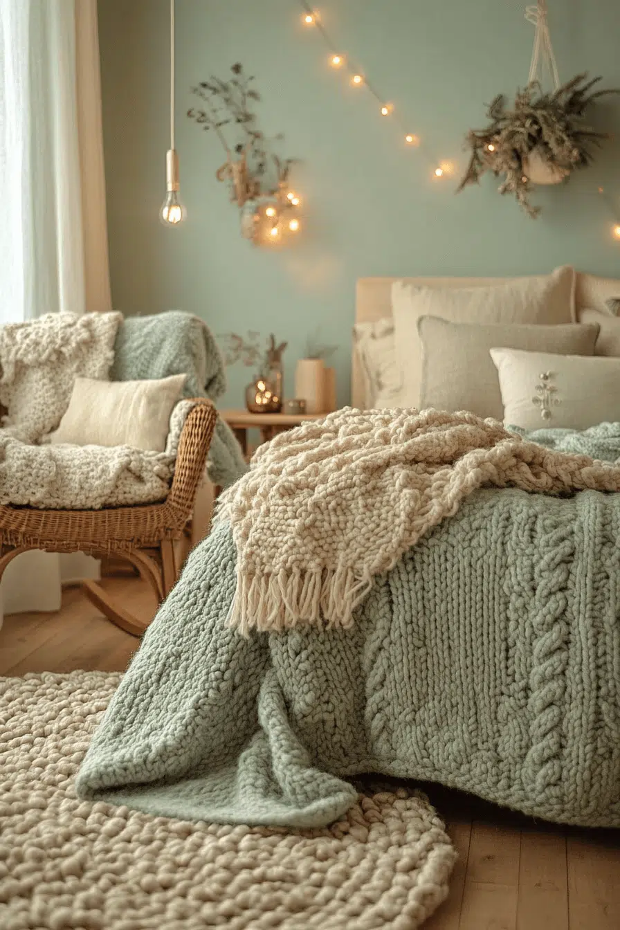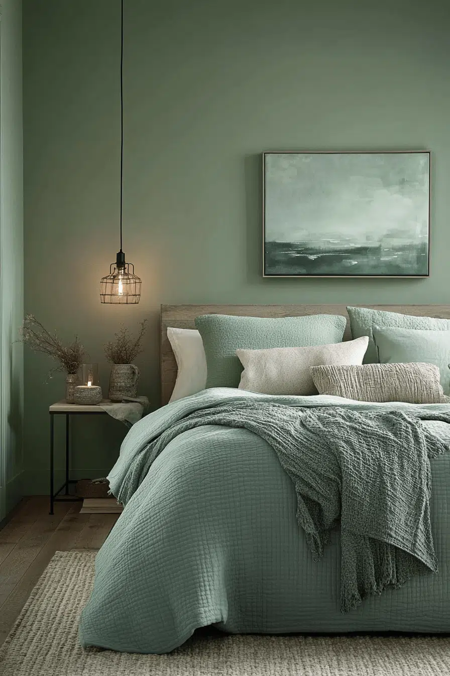 Layered textiles bring depth and comfort to a light sage green bedroom. Think plush duvets, textured pillows, and soft knit throws against the gentle green backdrop. The color anchors the space while fabrics add richness. Warm wood accents complement the hue effortlessly. The overall feel is inviting and polished. Tap to build your own cozy sage retreat!