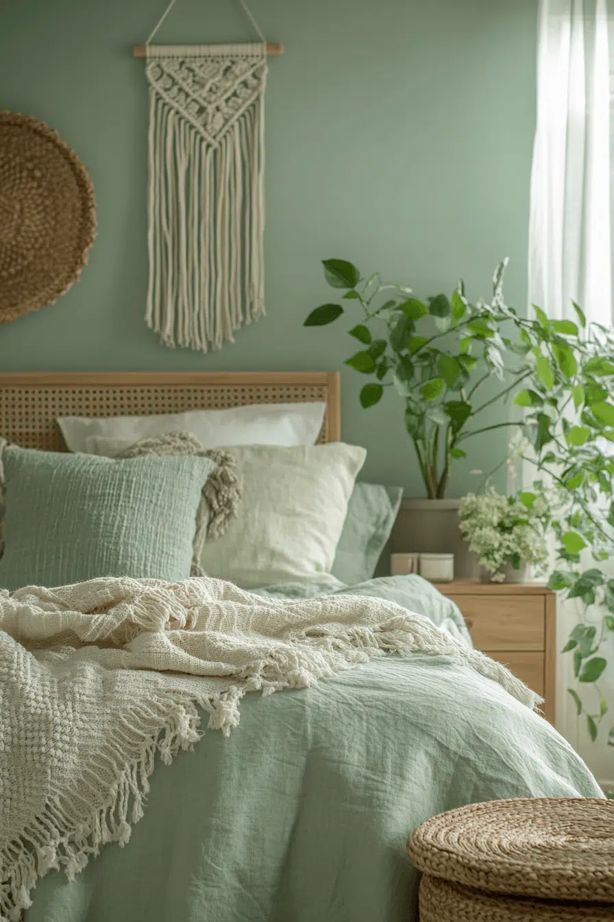 Introduce soft geometric patterns into a light sage green bedroom for subtle dimension. Simple artwork and structured decor complement the muted tone. The green prevents the design from feeling too rigid. Balanced styling keeps the space fresh. It’s calm with a contemporary edge. Click to explore structured serenity!