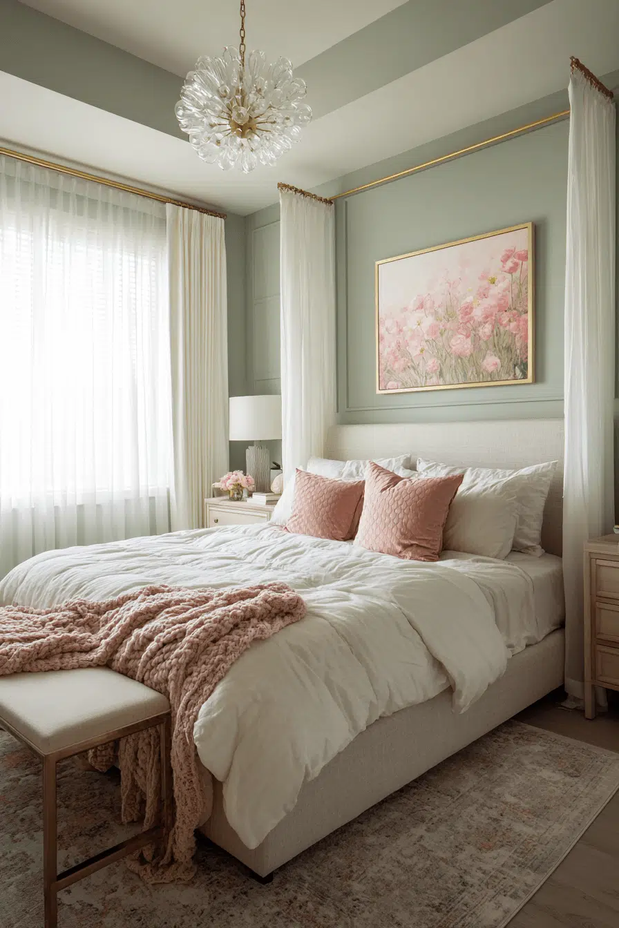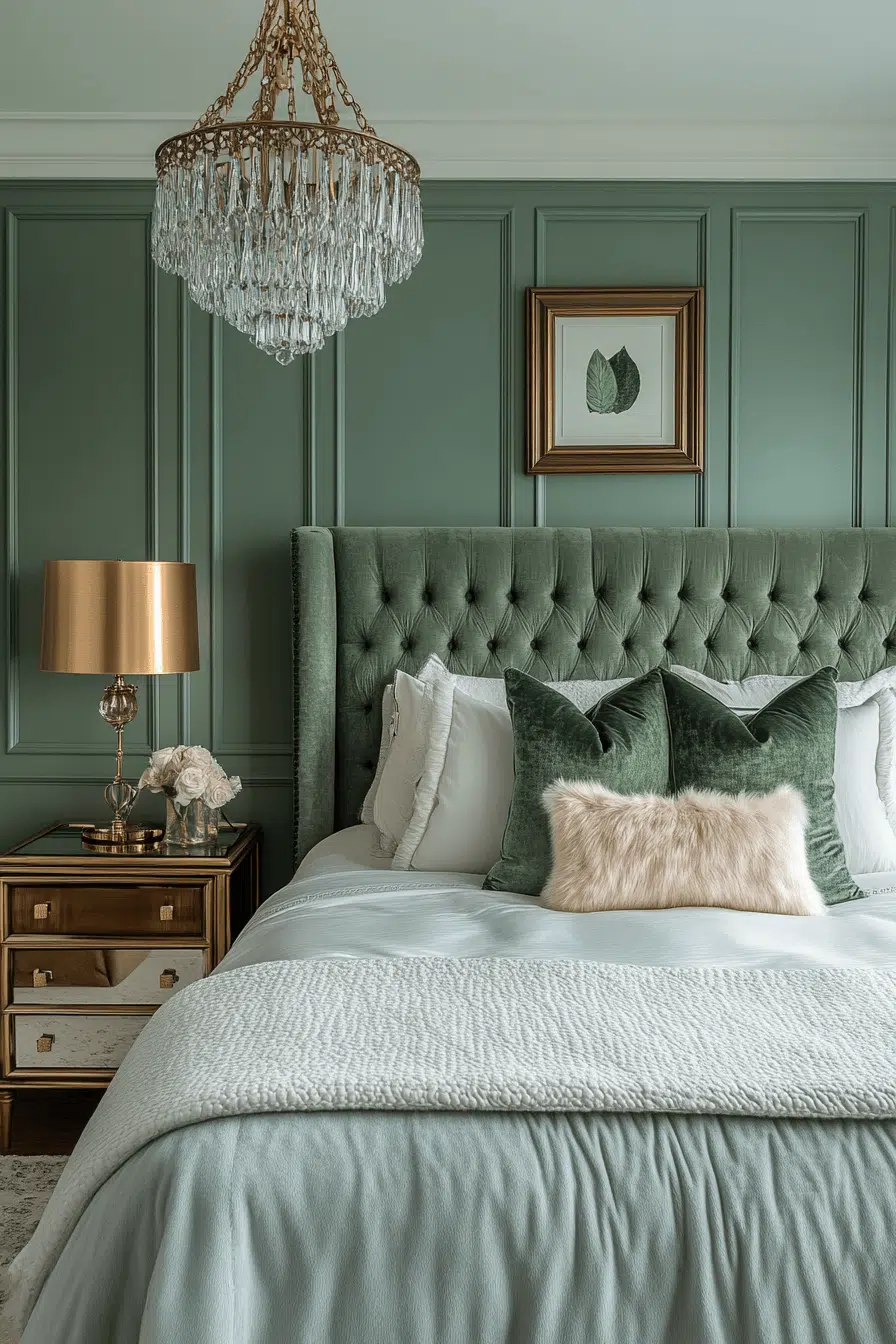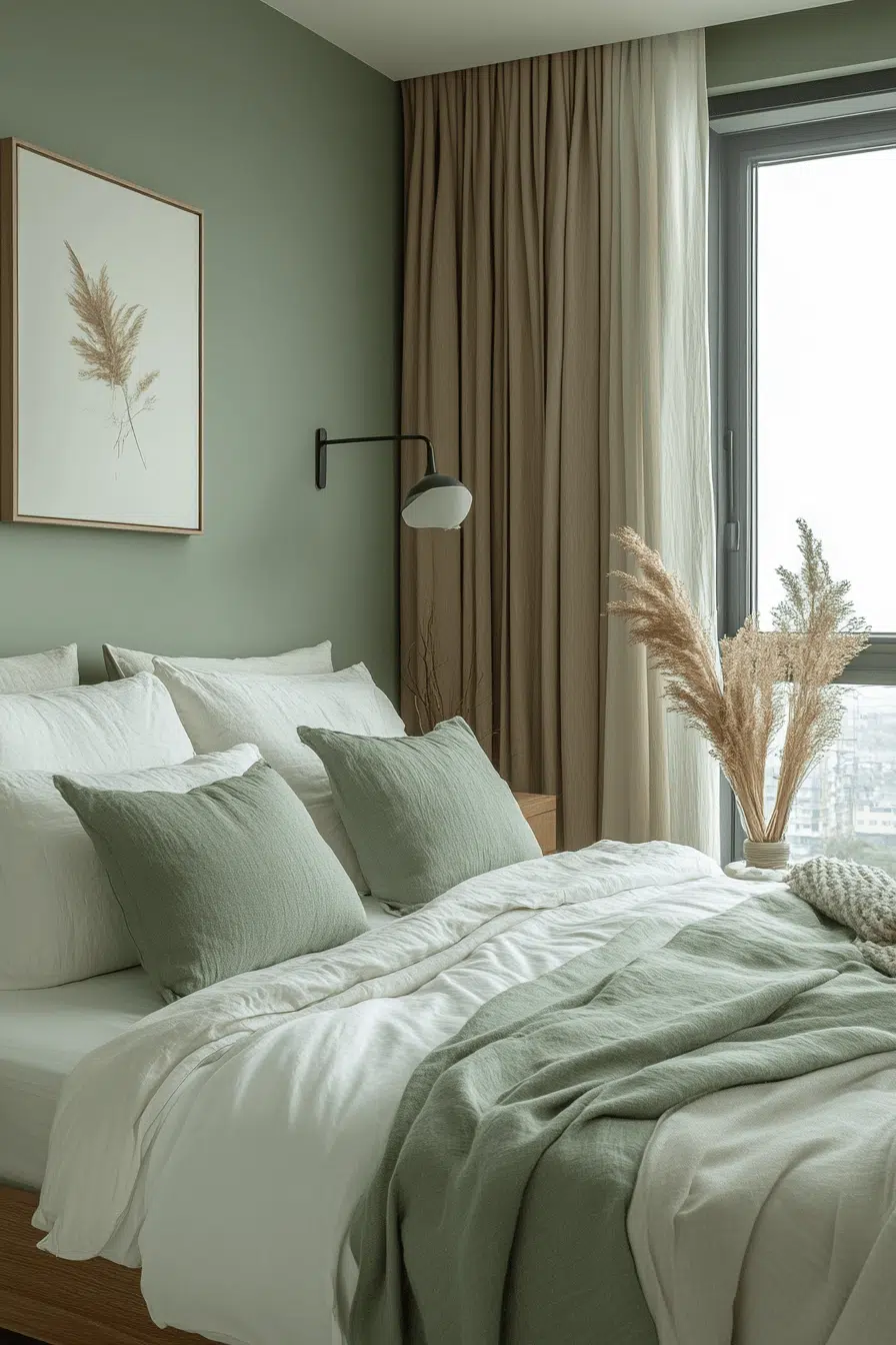 Introduce subtle luxury into a light sage green bedroom with brass lamps and satin accents. The green tone softens metallic finishes beautifully. Velvet cushions or a tufted bench add quiet elegance. The palette feels refined without being flashy. It’s understated glamour at its finest. Click to elevate your sage sanctuary!