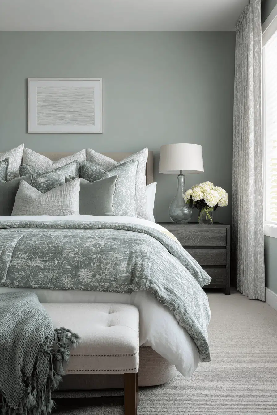 A light sage green bedroom becomes especially tranquil when styled with monochromatic layers. Similar shades of sage and cream create depth without contrast. The tonal effect feels sophisticated and calming. Varying textures keep it visually rich. It’s understated elegance at its best. Tap to perfect the layered look!