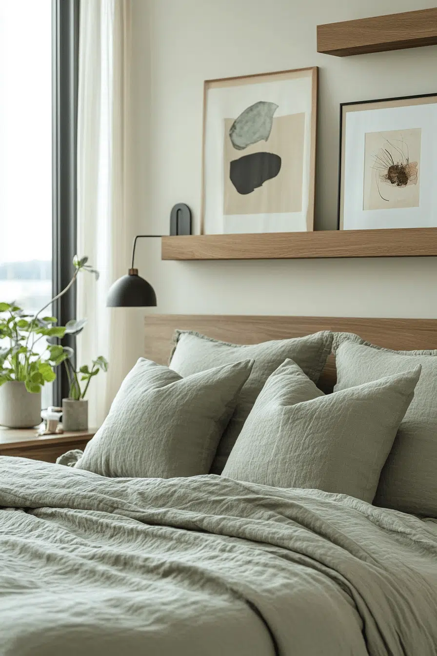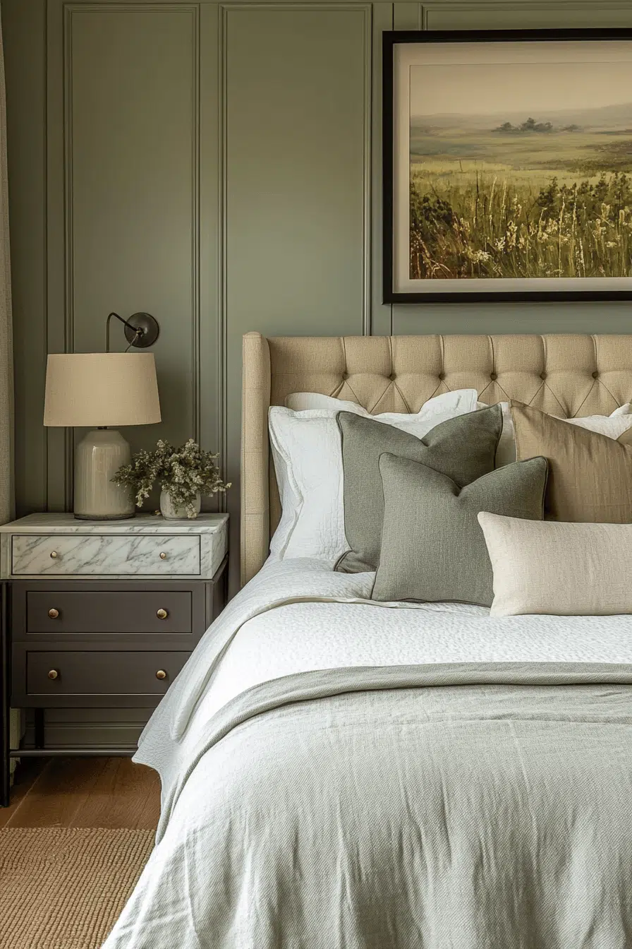 Elevate your light sage green bedroom with a statement headboard in neutral linen or subtle texture. The muted green highlights the focal piece beautifully. Warm wood side tables enhance cohesion. The palette remains calm and refined. The result feels tailored yet inviting. Click to anchor your space with style!
