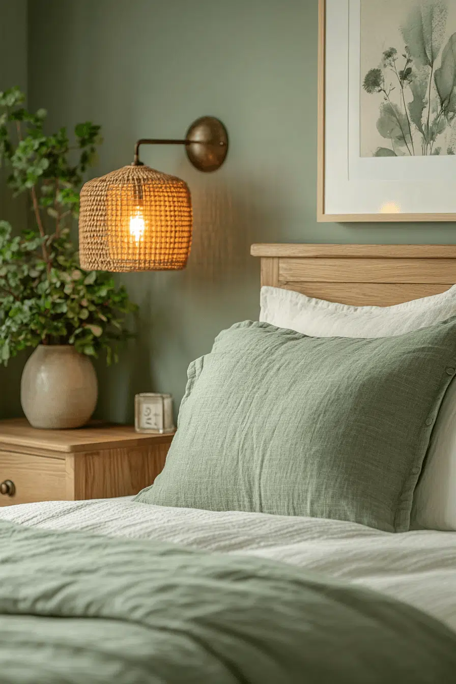 Add personality to a light sage green bedroom with sculptural lighting and textured wall art. The muted hue allows statement pieces to stand out gracefully. Neutral bedding anchors the design. The result feels curated and expressive. It’s artistic yet serene. Click to style your space with confidence!