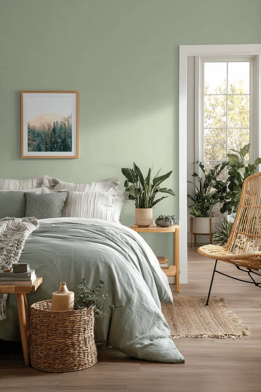 A light sage green bedroom can feel airy and coastal when styled with breezy fabrics and natural light. Sheer curtains and sandy tones enhance the softness. The green hue mimics sea-glass serenity. Light layering keeps the space open and uplifting. It’s relaxed elegance at its best. Tap to bring breezy calm into your bedroom!