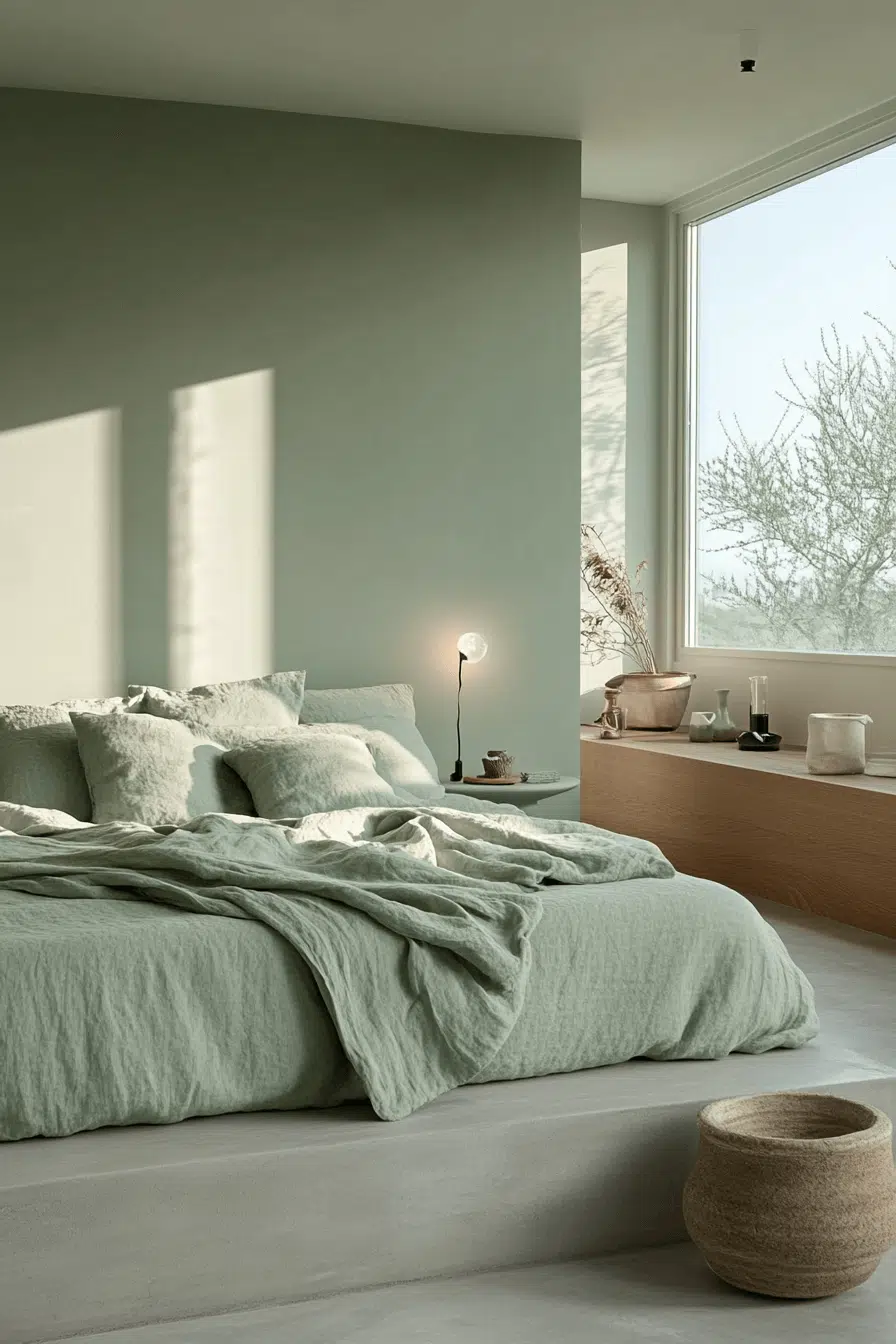 Japandi-inspired elements pair effortlessly with a light sage green bedroom. Low-profile furniture and natural textures create mindful simplicity. The green adds warmth to the minimalist aesthetic. Linen bedding enhances organic softness. The space feels intentional and balanced. Click to discover calm, curated living!