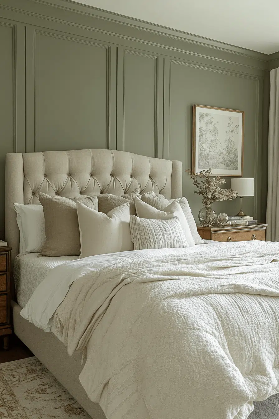 A light sage green bedroom feels romantic when paired with flowing drapery and delicate lighting. The hue enhances softness without feeling overly sweet. Cream and champagne accents amplify elegance. The atmosphere becomes dreamy yet sophisticated. It’s gentle luxury for everyday living. Tap to create your romantic retreat!