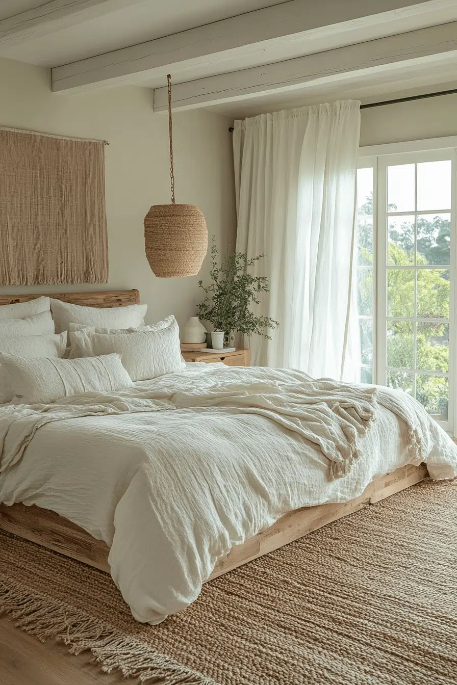 A light sage green bedroom layered with rattan, jute, and raw wood feels beautifully grounded. The green hue ties natural materials together seamlessly. Neutral bedding keeps the look airy. The aesthetic feels relaxed yet refined. It’s earthy elegance with a modern touch. Tap to bring nature-inspired warmth home!
