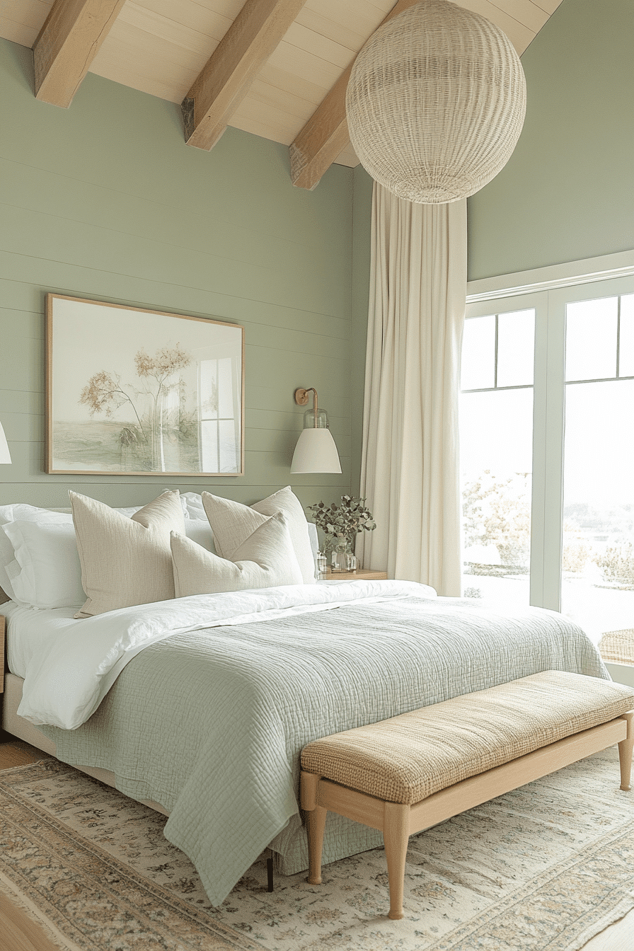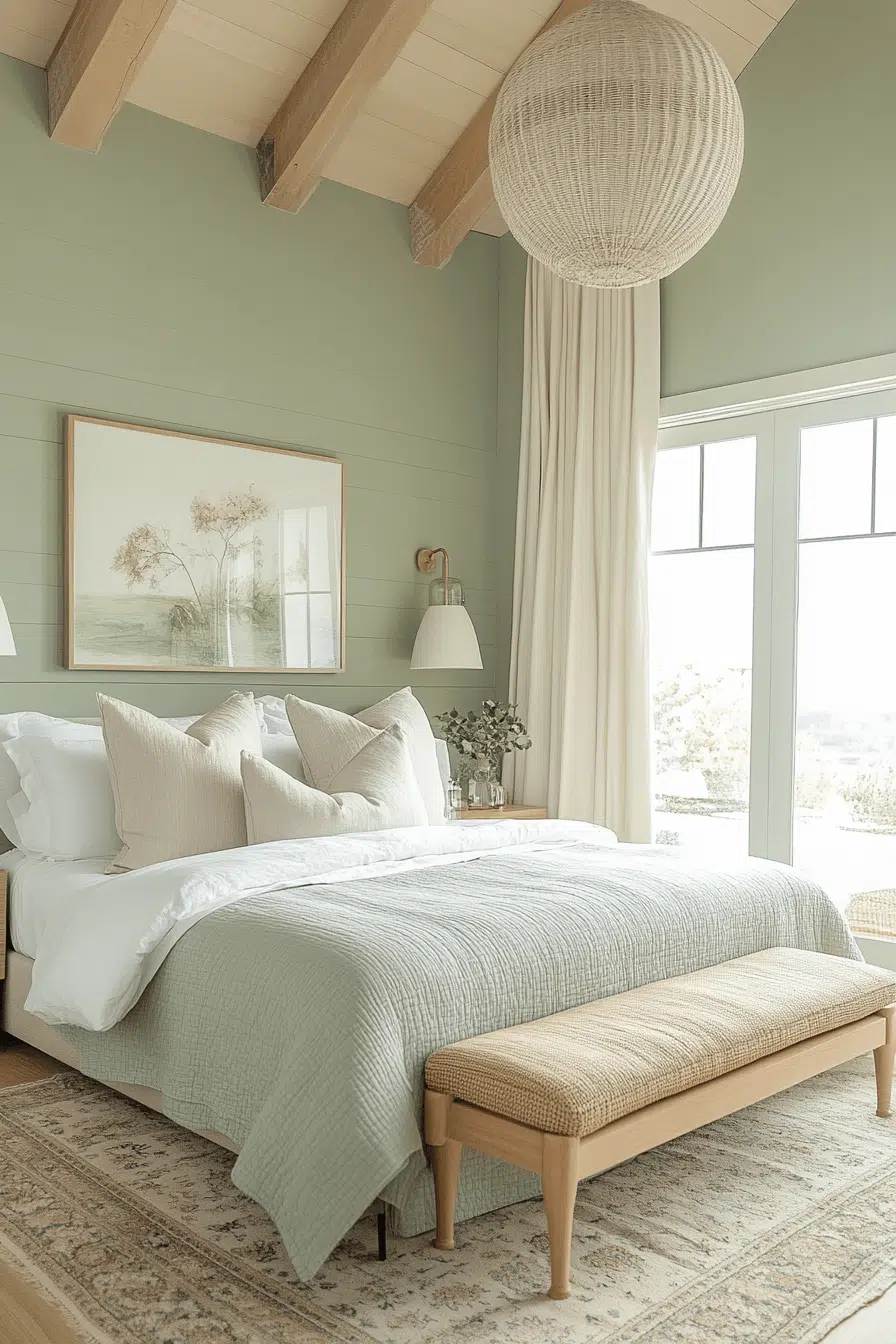 A light sage green bedroom can feel airy and coastal when styled with breezy fabrics and natural light. Sheer curtains and sandy tones enhance the softness. The green hue mimics sea-glass serenity. Light layering keeps the space open and uplifting. It’s relaxed elegance at its best. Tap to bring breezy calm into your bedroom!