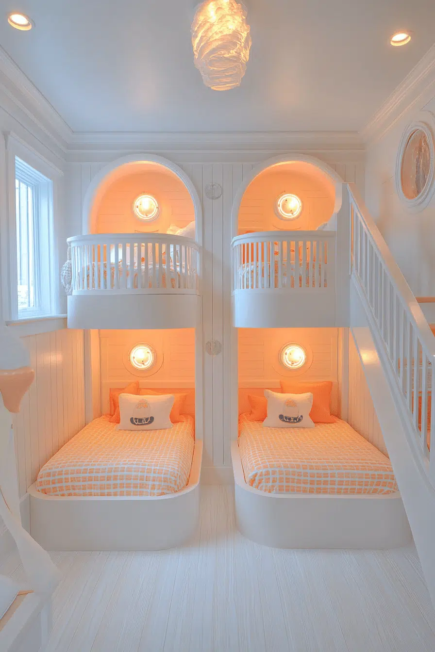 Space efficiency doubles with twin loft beds for small rooms arranged vertically. Each sleeper enjoys defined space with built-in storage. Guardrails and ladders keep the structure secure and accessible. This layout supports comfort and organization. Shared rooms feel less crowded.
