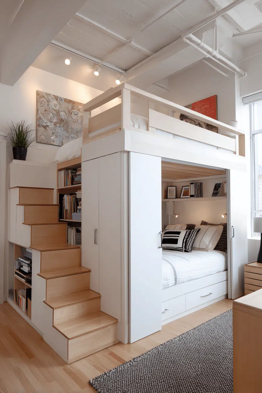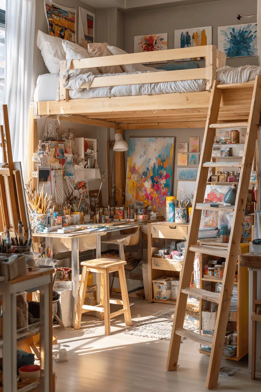 Creative focus flourishes in loft beds for small rooms with art-ready workspaces below. Desks, shelving, and lighting create an inspiring zone beneath the elevated bed. The separation of sleep and work improves flow and focus. Ideal for compact homes and studios. Creativity thrives vertically.