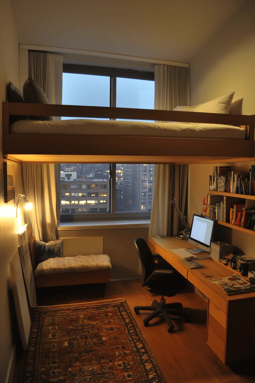 Study-friendly layouts elevate loft beds for small rooms built for focus and productivity. The lower area becomes a dedicated desk zone with shelving and task lighting. The raised bed keeps work areas distraction-free. This design supports daily routines. Organization feels effortless.