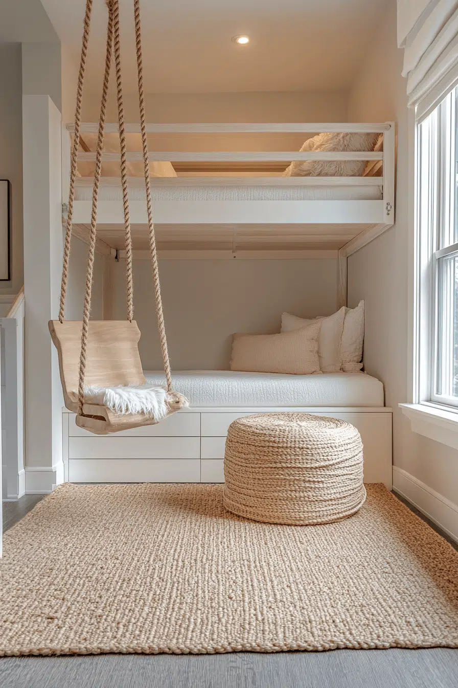 Whimsical comfort appears in loft beds for small rooms featuring swings or hanging chairs underneath. The open area becomes a cozy lounging spot. The elevated bed keeps the footprint compact. This design adds personality and relaxation. It’s fun without clutter.