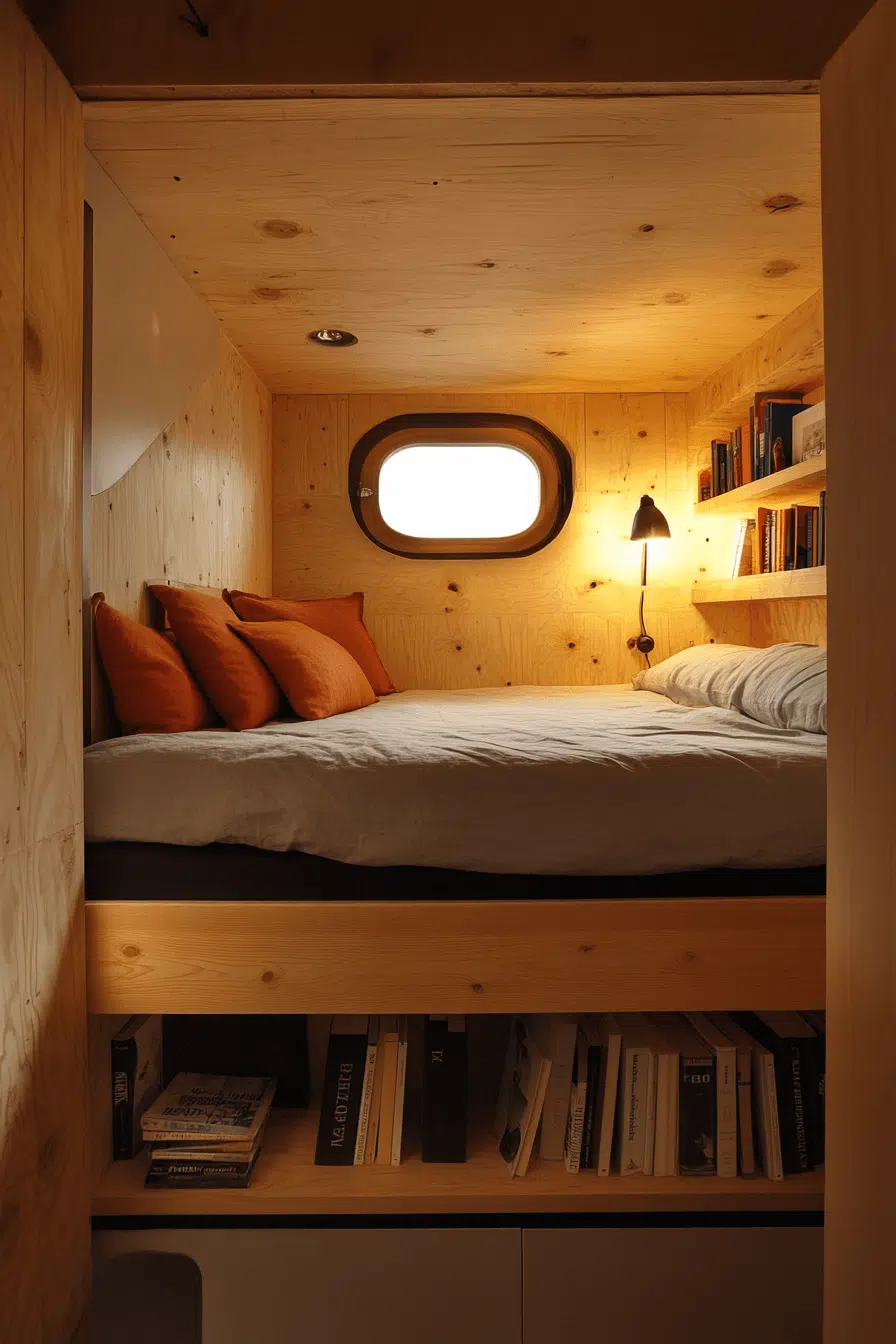 Quiet comfort defines loft beds for small rooms with reading retreats below. Cushions, soft lighting, and shelves create an inviting escape beneath the bed. This layout maximizes vertical space for relaxation. It’s perfect for book lovers and dreamers. Calm lives underneath.