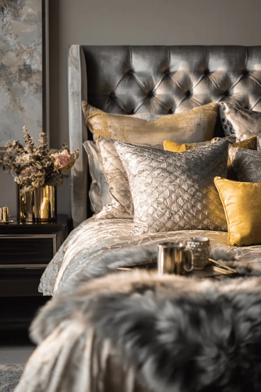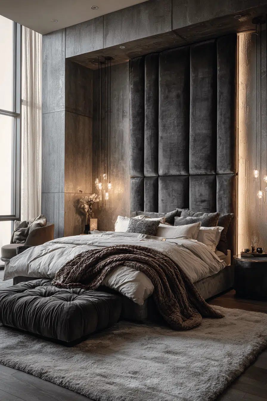 Velvety finishes bring a plush softness to luxurious bedrooms with textures that feel both rich and inviting. Upholstered elements add depth throughout the space. Light reflects subtly off the fabric for added dimension. Neutral or bold tones adapt to different styles. Smooth materials balance the softness. The room feels warm and elevated. Add velvet richness to your bedroom today!