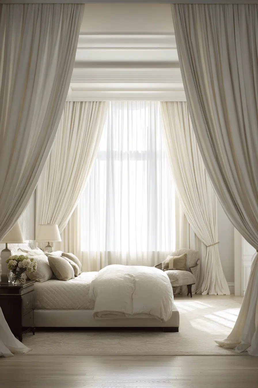Draped elegance transforms luxurious bedrooms with flowing fabrics that add height, movement, and softness. Long curtains elongate the space visually. Lightweight layers create an airy feel. Heavier fabrics introduce depth. Neutral tones maintain harmony. The design feels graceful and refined. Add dramatic drapery to your bedroom today!
