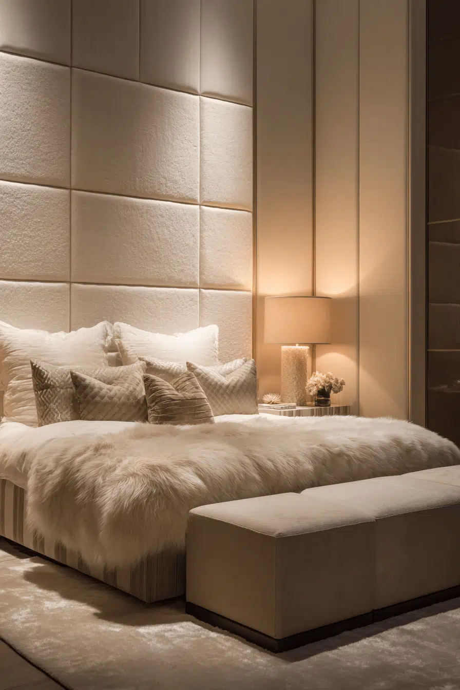 Padded design elements enrich luxurious bedrooms with soft surfaces that create comfort and visual warmth. Upholstered pieces add texture and cohesion. Rich materials enhance the overall feel. The space feels inviting and layered. Lighting enhances the softness. The design feels cozy and elevated. Introduce plush comfort into your bedroom today!