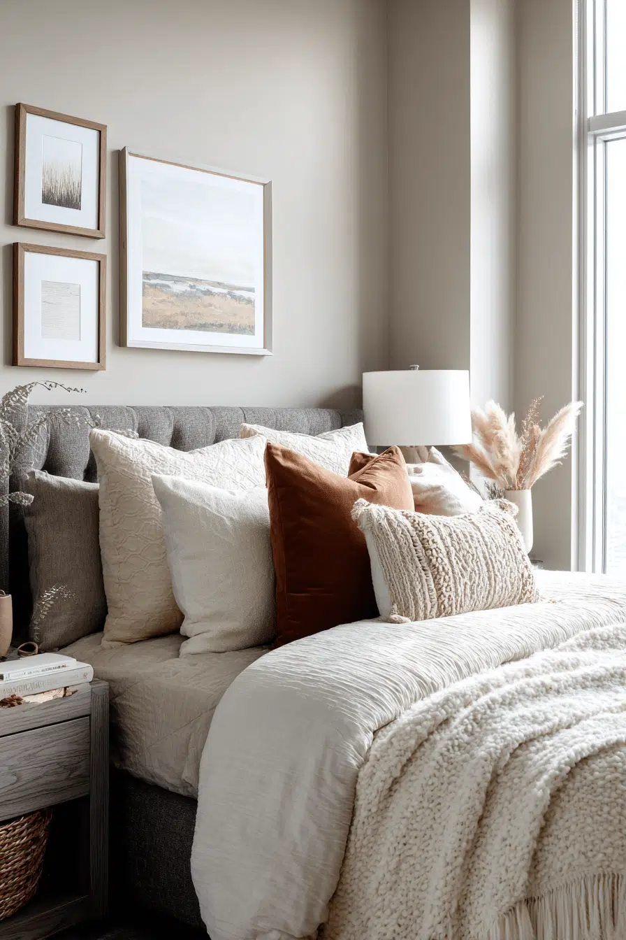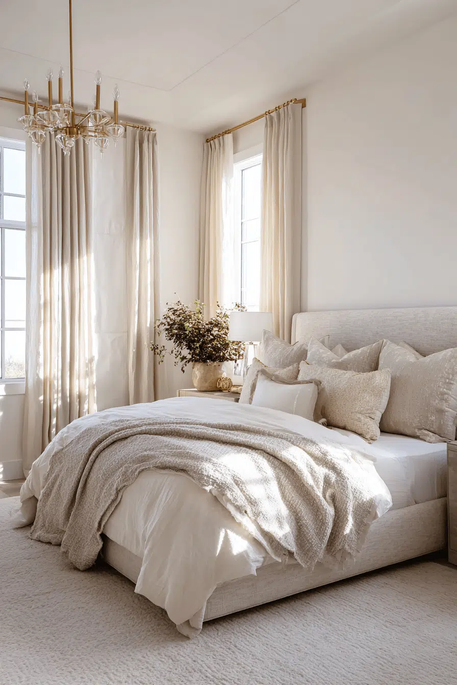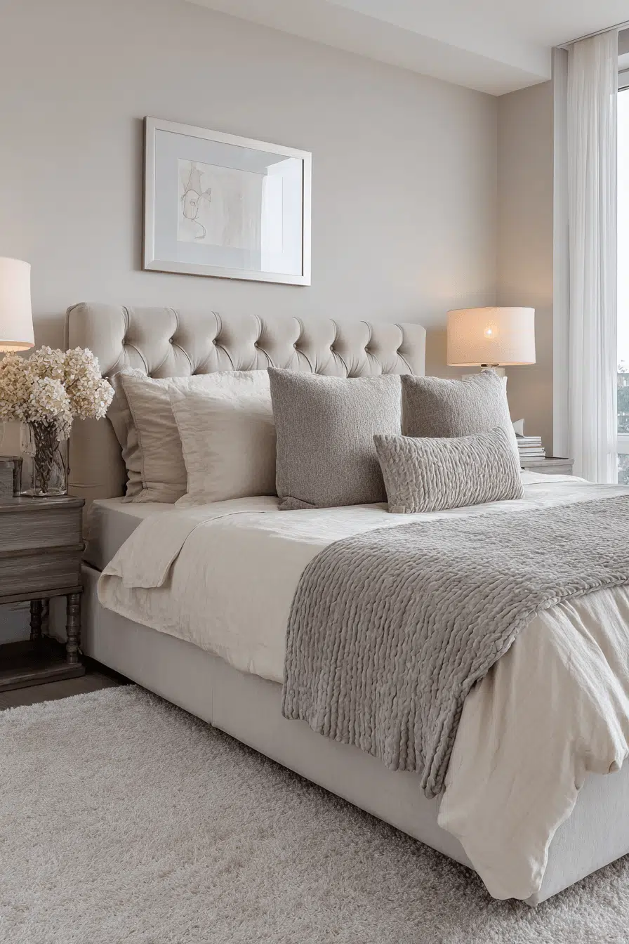 Gentle tonal harmony shapes luxurious bedrooms into warm, inviting environments that feel timeless and serene. Creamy hues and soft taupes blend seamlessly across the space. Rich fabrics like boucle and linen introduce quiet texture. Oversized headboards add a touch of sophistication. Natural light enhances the softness of every layer. The room feels cozy yet refined. Embrace soft elegance in your bedroom today!