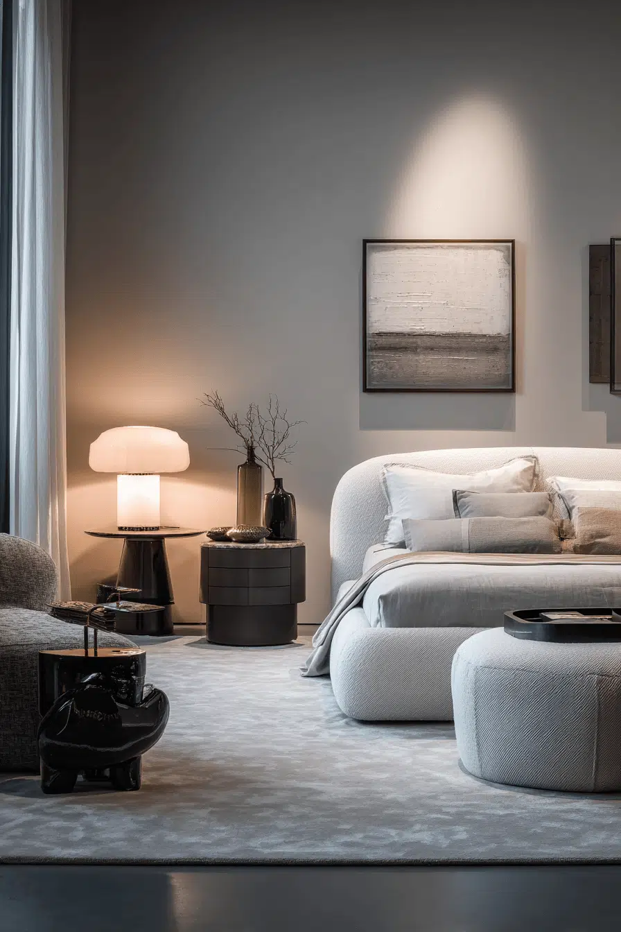 Artful shapes enhance luxurious bedrooms with sculptural pieces that add movement and visual intrigue. Unique furniture creates focal points. Clean palettes maintain balance. Lighting highlights the forms beautifully. The space feels creative and elevated. The design feels modern and expressive. Add artistic flair to your bedroom today!
