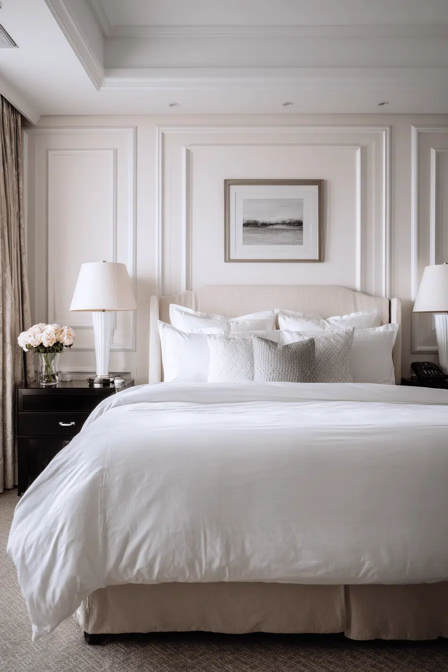 Five-star styling elevates luxurious bedrooms with crisp detailing and perfectly coordinated design that feels polished and relaxing. Fresh linens and layered pillows create instant comfort. Symmetrical layouts bring order and calm. Subtle lighting enhances the restful mood. High-end finishes add a refined touch. The entire space feels structured yet inviting. Bring luxury hotel energy into your home today!