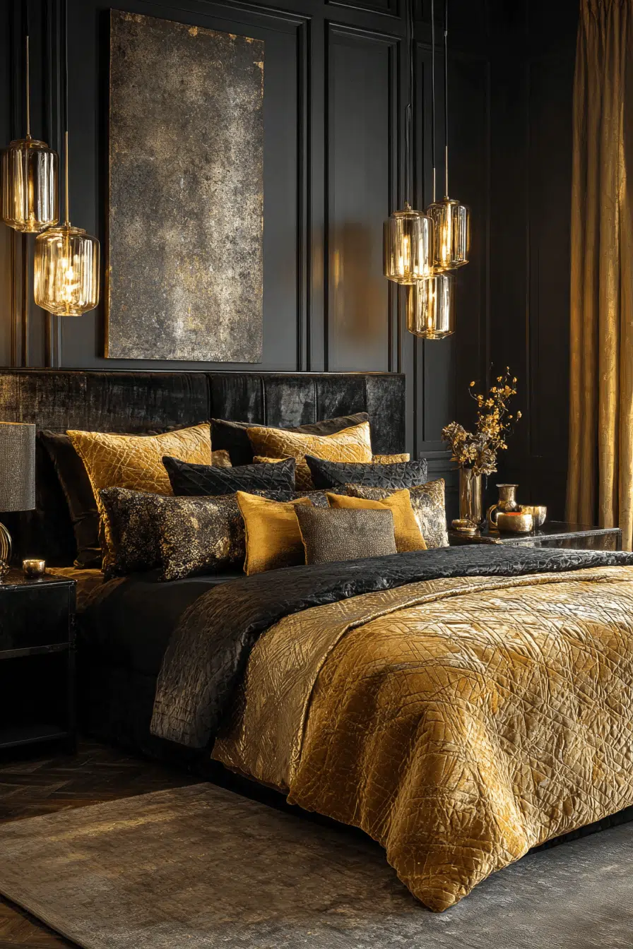 Dramatic contrast defines luxurious bedrooms with bold combinations that feel powerful and refined. Deep tones create a rich backdrop for metallic accents. Gold finishes introduce warmth and elegance. Plush materials enhance the overall richness. Strategic lighting adds depth and dimension. The design feels confident and upscale. Make a bold impact with your bedroom today!