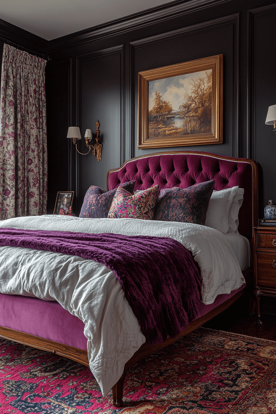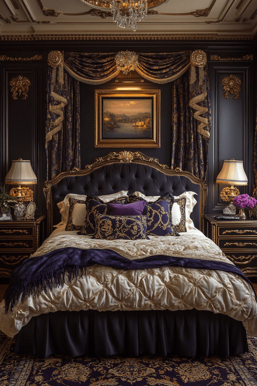 Bold, vibrant colors meet lavish fabrics and ornate décor to create a striking statement. Every detail—from intricate carvings to gilded accents—is chosen for drama and beauty, transforming the bedroom into a living piece of art.