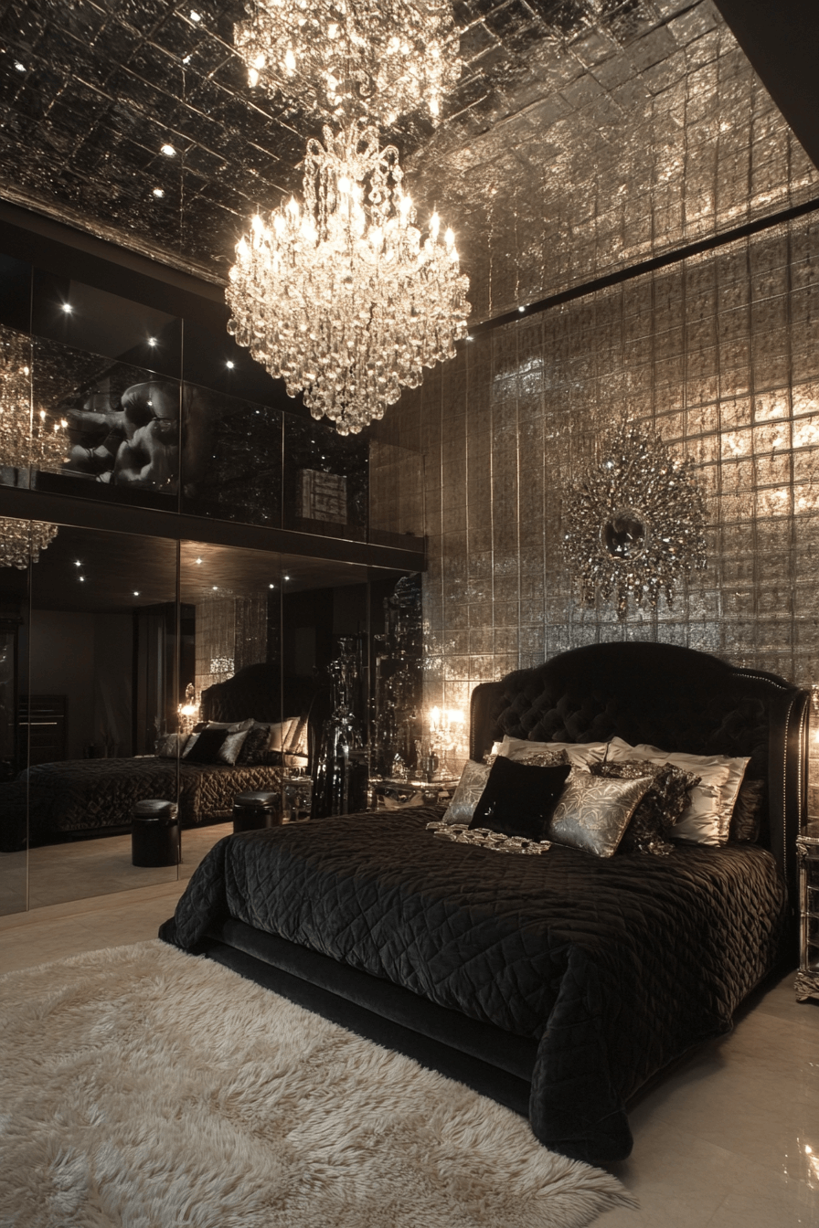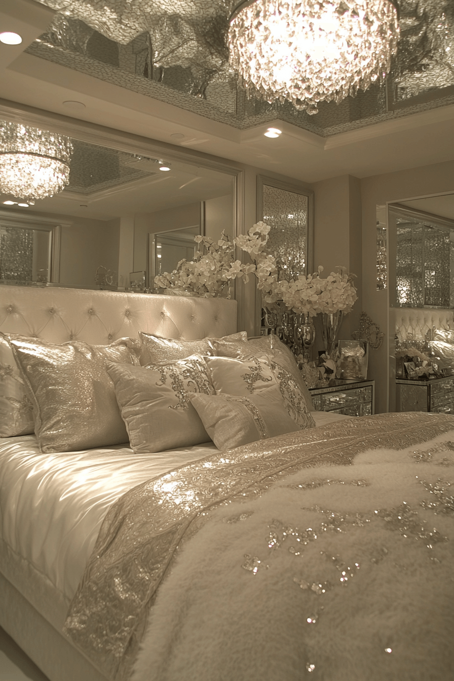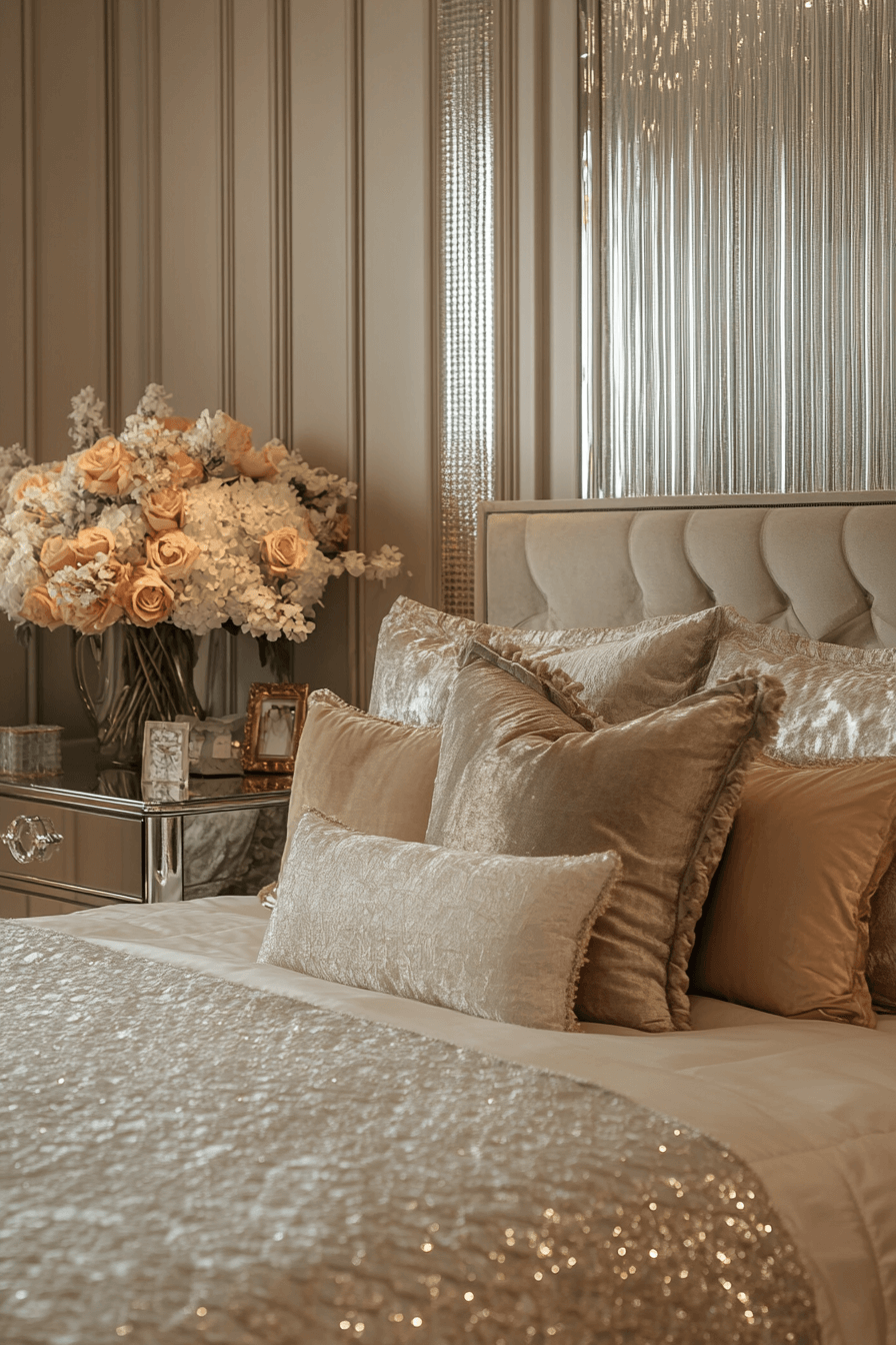 Mirrored surfaces catch every flicker of light, expanding the room’s sense of space while adding instant sparkle. These reflective elements work in harmony with plush fabrics and polished accents, marrying glamour with practicality.