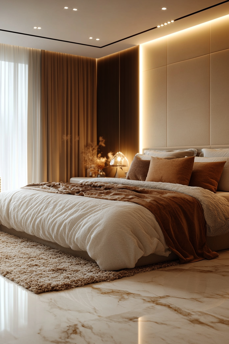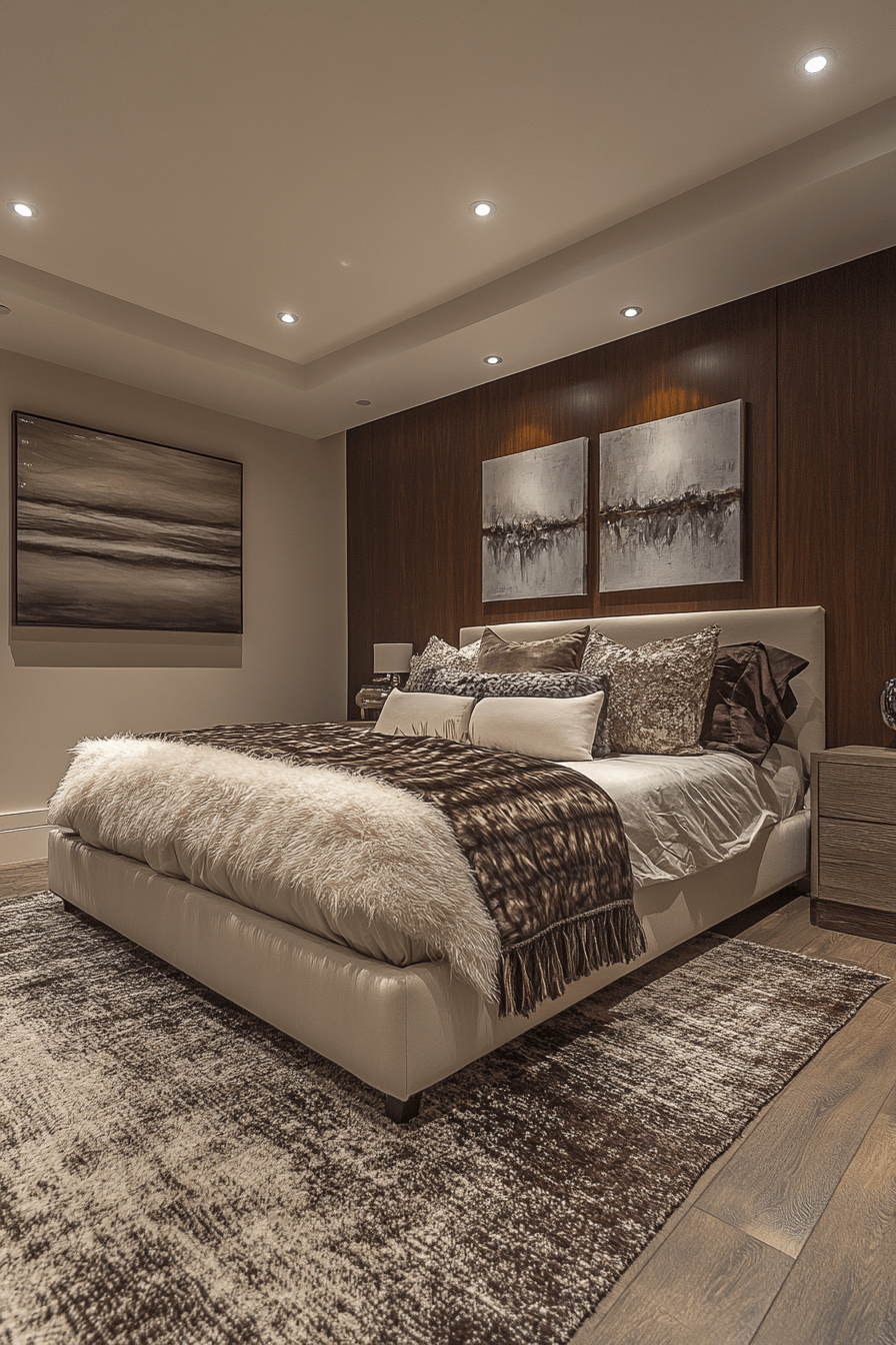 Sleek modern finishes meet indulgent comfort in this luxury bedroom master, where smooth surfaces flow into plush textiles for a space that feels both contemporary and inviting. Carefully chosen furnishings and a refined palette create harmony, while every accent is designed to impress.
