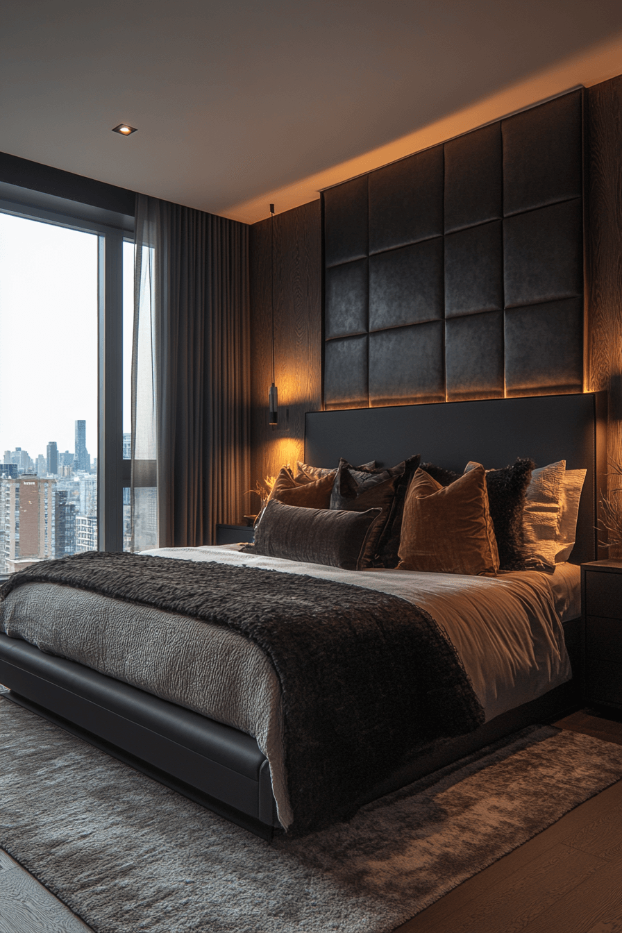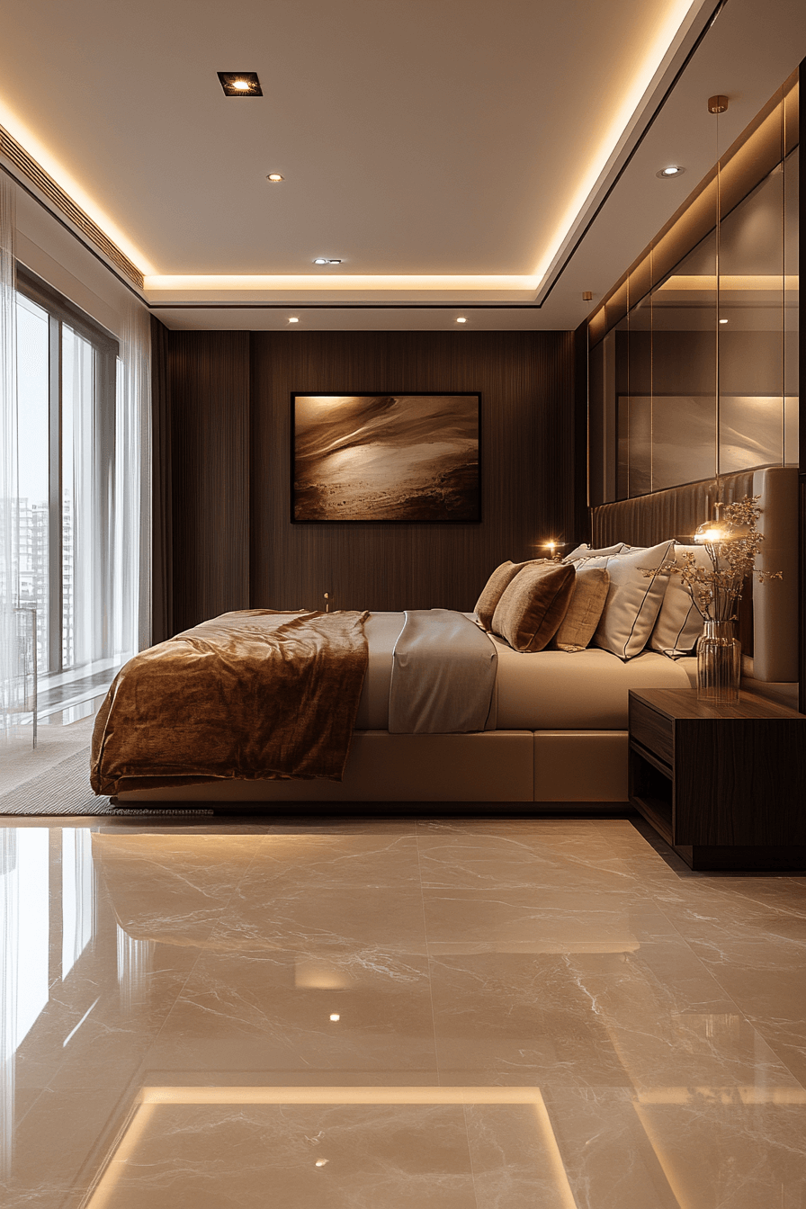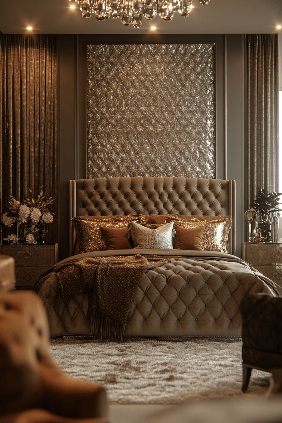 Sleek metallic finishes combine with contemporary silhouettes to give this luxury bedroom master a bold, glamorous vibe. Light dances off reflective surfaces, enhancing the space’s energy and allure.