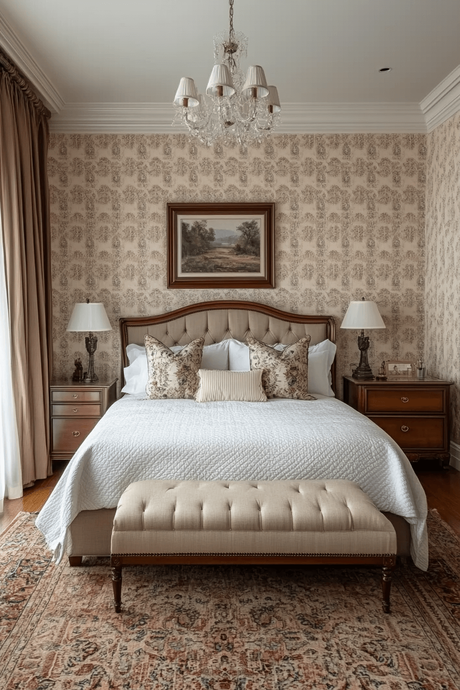 Timeless furnishings anchor the room in tradition, while premium fabrics drape with understated luxury. Warm, welcoming hues complement the elegant details, creating a bedroom that feels as comforting as it is refined.