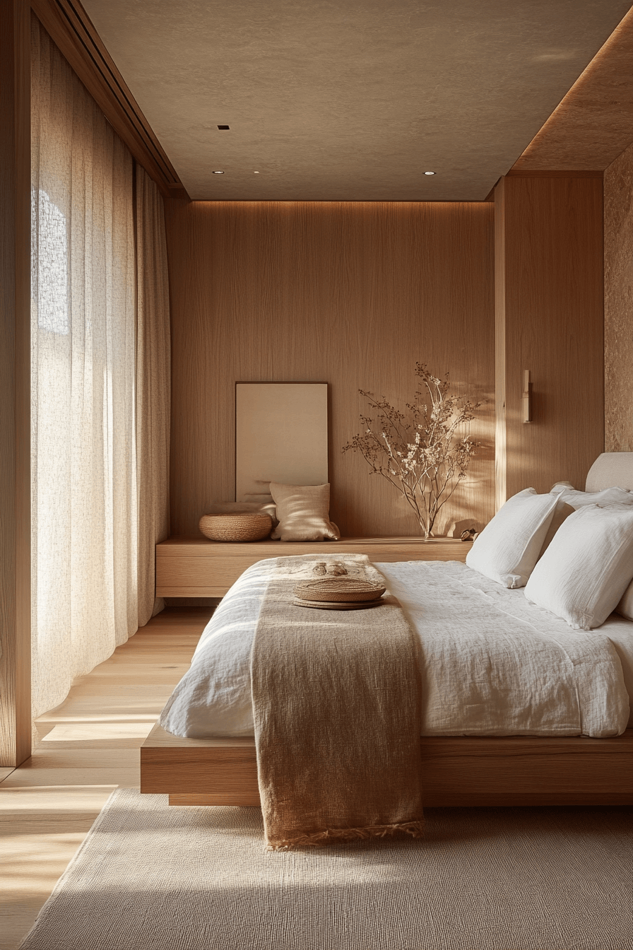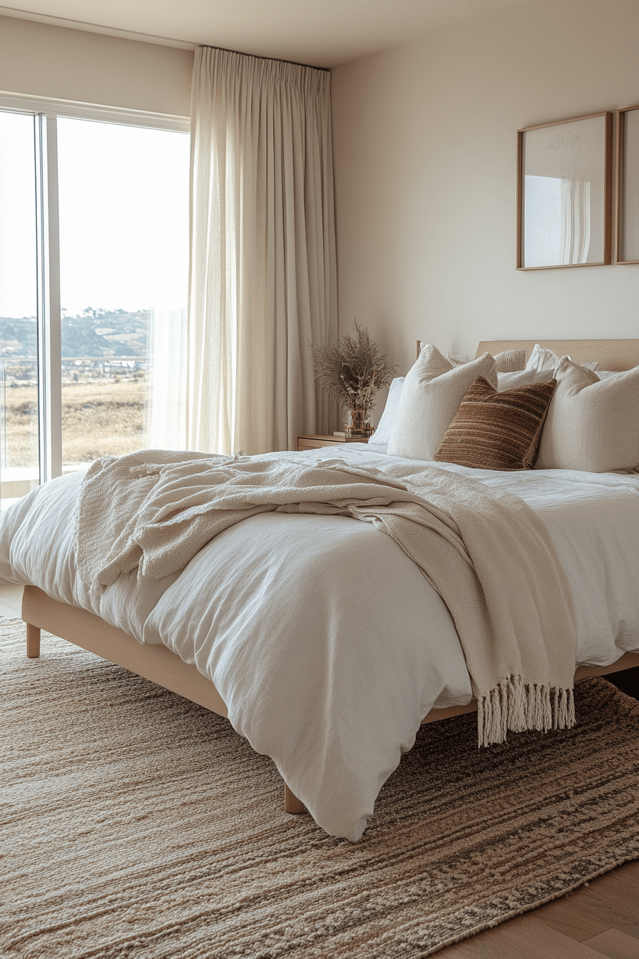 Minimalist furniture stands poised against a palette of soft neutrals, creating a light, calming space. Each material—smooth wood, crisp linens—is chosen for its purity of form and comfort.