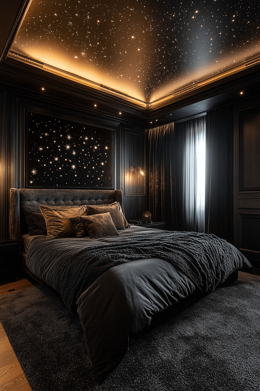 Deep midnight shades wrap the room in a cocoon of mystery, while subtle celestial motifs glimmer like distant stars. Starry accents in textiles and décor add a touch of whimsy, balancing the dark palette with playful elegance.