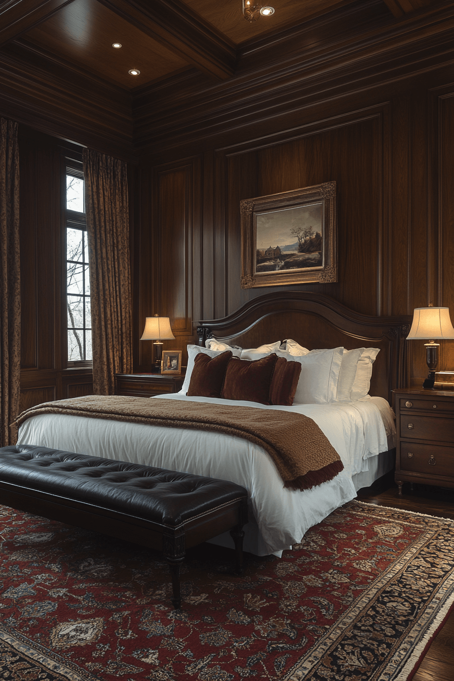 Richly crafted woodwork frames the space with warmth and depth, from carved headboards to intricate paneling. The natural grain and fine finishes speak to skillful artistry, bringing a tactile richness that feels grounded yet luxurious.