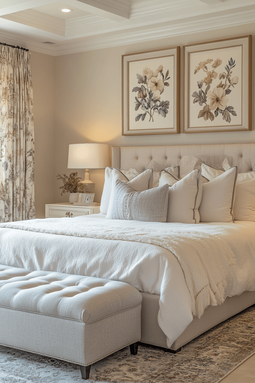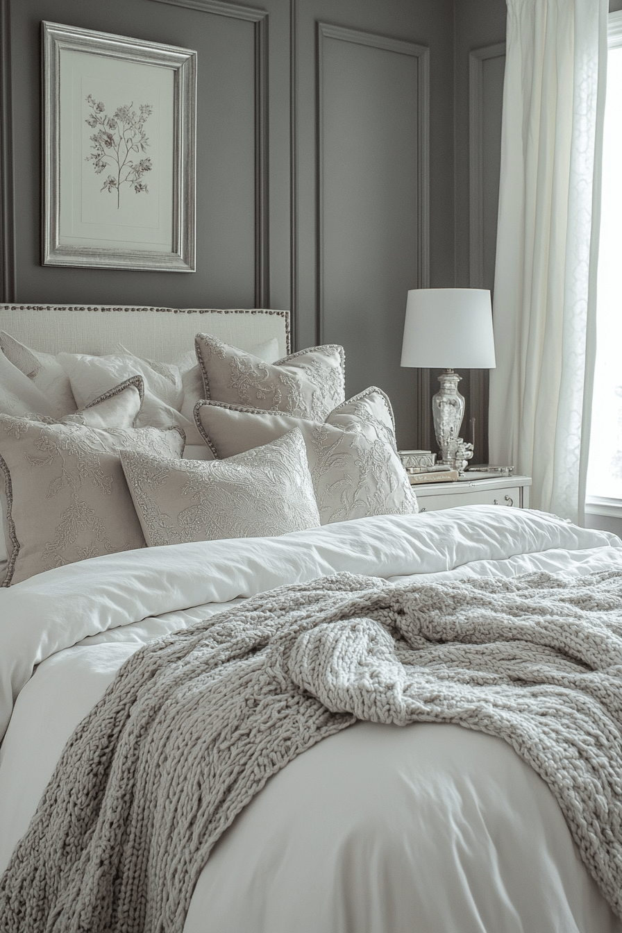 Cool silver accents soften the crisp whites in this luxury bedroom master, creating a polished yet calming effect. Layers of texture add depth, ensuring it feels welcoming while remaining refined.