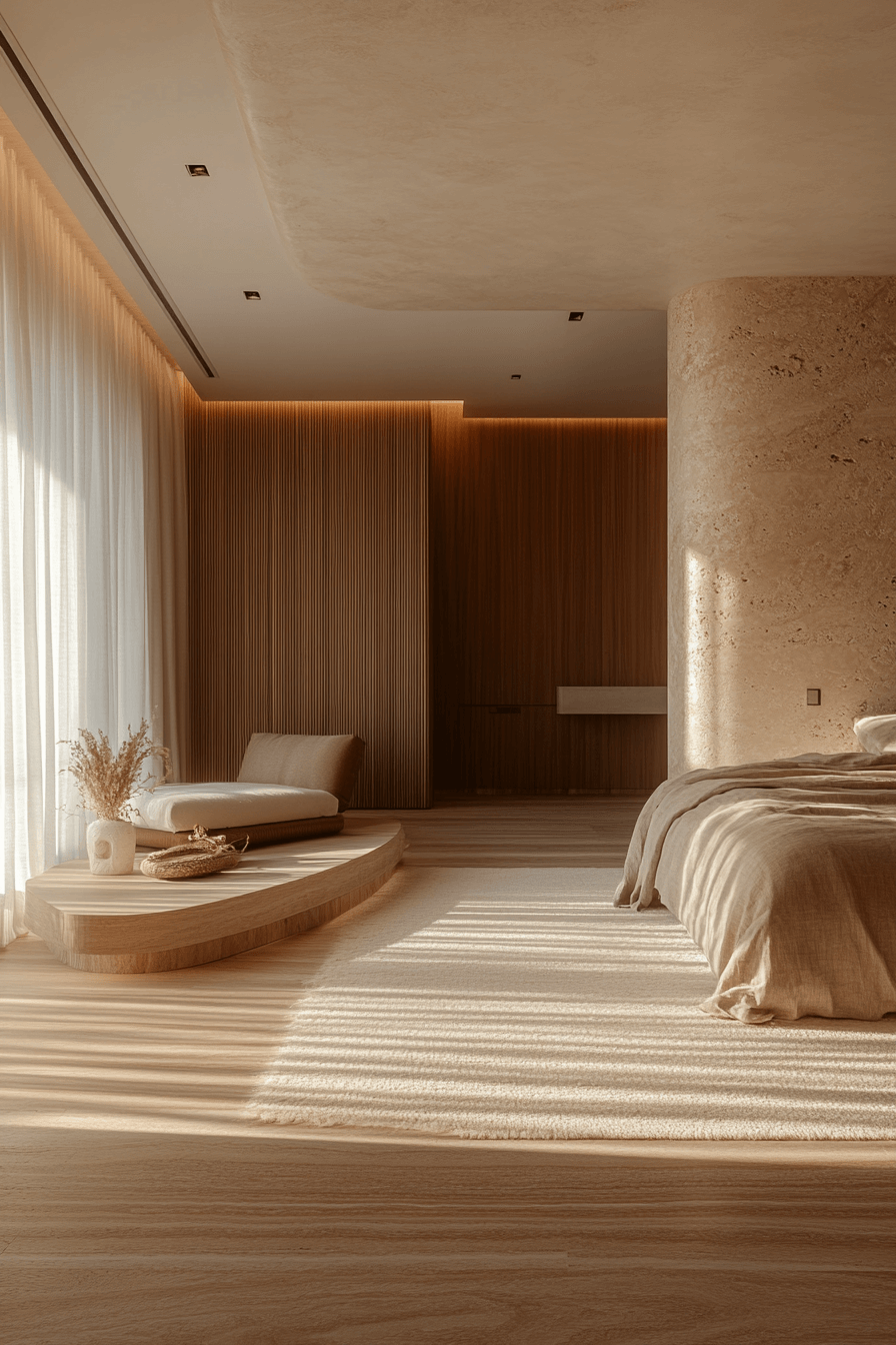 Natural stone accents and fine wood details bring an organic richness to this luxury bedroom master. The minimal layout allows the beauty of the materials to take center stage, creating understated yet striking elegance.