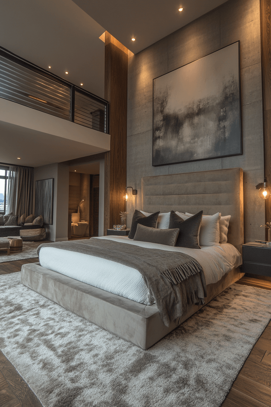 Towering ceilings and streamlined furniture give this luxury bedroom master a chic, loft-inspired atmosphere. Open space meets sophisticated detail for a modern architectural statement.