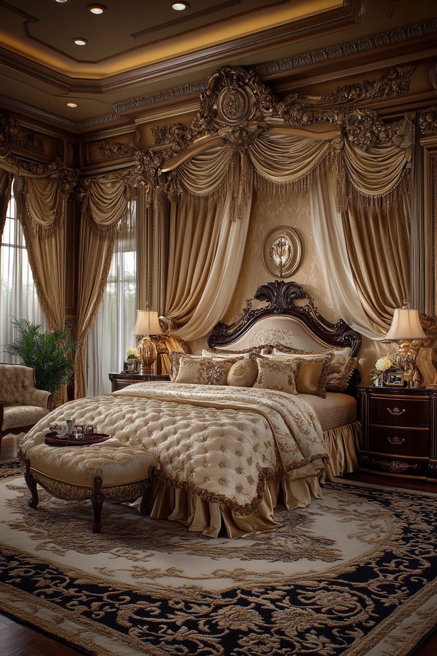 Ornate gold accents and plush drapery make this luxury bedroom master radiate regal charm. Statement mirrors and lavish fabrics create a space fit for royalty without losing comfort.
